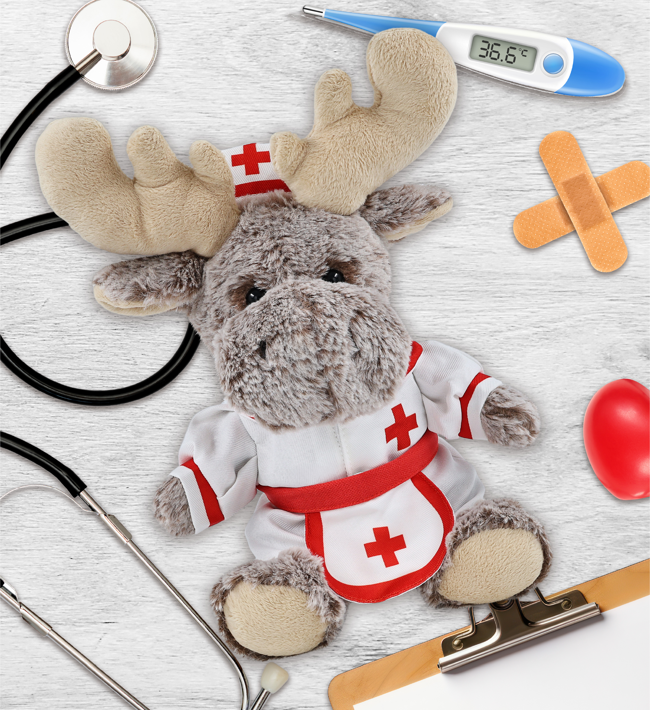 - Personalization, Customization, and Add-On Options – The stuffed moose comes dressed in a cute nurse costume, complete with nurse cap, nurse dress, and apron. Make your nurse teddy bear stuffed animal plush special by adding a personalized name, which we’ll imprint onto the plush. You can also customize your nurse moose plush by adding any of our add-ons to create the perfect gift: 1) Gift Bag 2) Tissue Paper 3) Greeting Card.