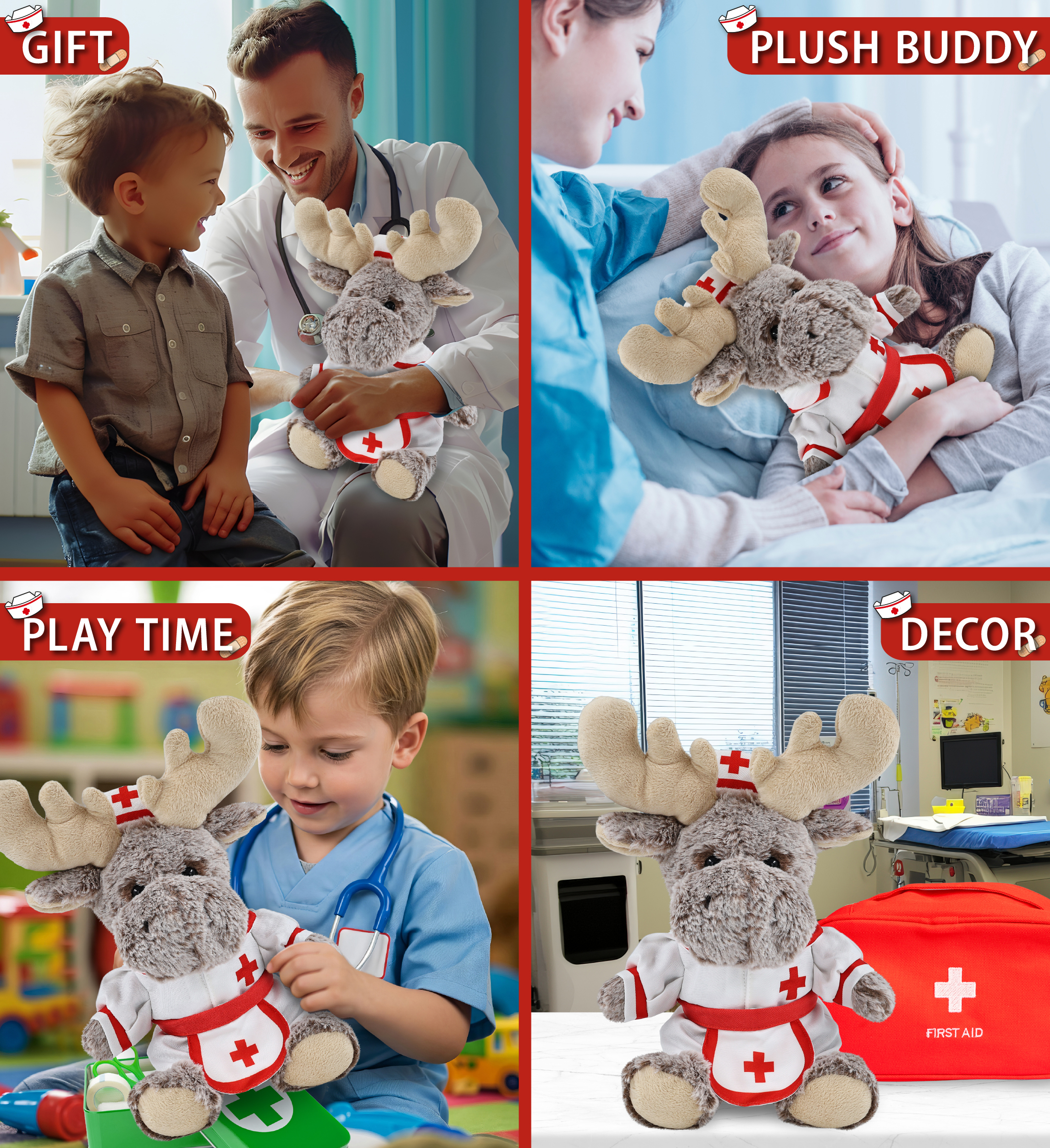 - Perfect Wild Animal Stuffed Toy Nurse Plush for Those Who Appreciate Health Care Workers – If you’re looking for a gift for nurse graduate, a get well teddy bear for your sick friend. The stuffed nurse moose brings a comforting and playful vibe to any occasion. Ideal hospital gifts for children to make them feel safe or as medical toys for kids to inspire them at a young age. The perfect stuffed animal moose for nurses and for cool storytelling.