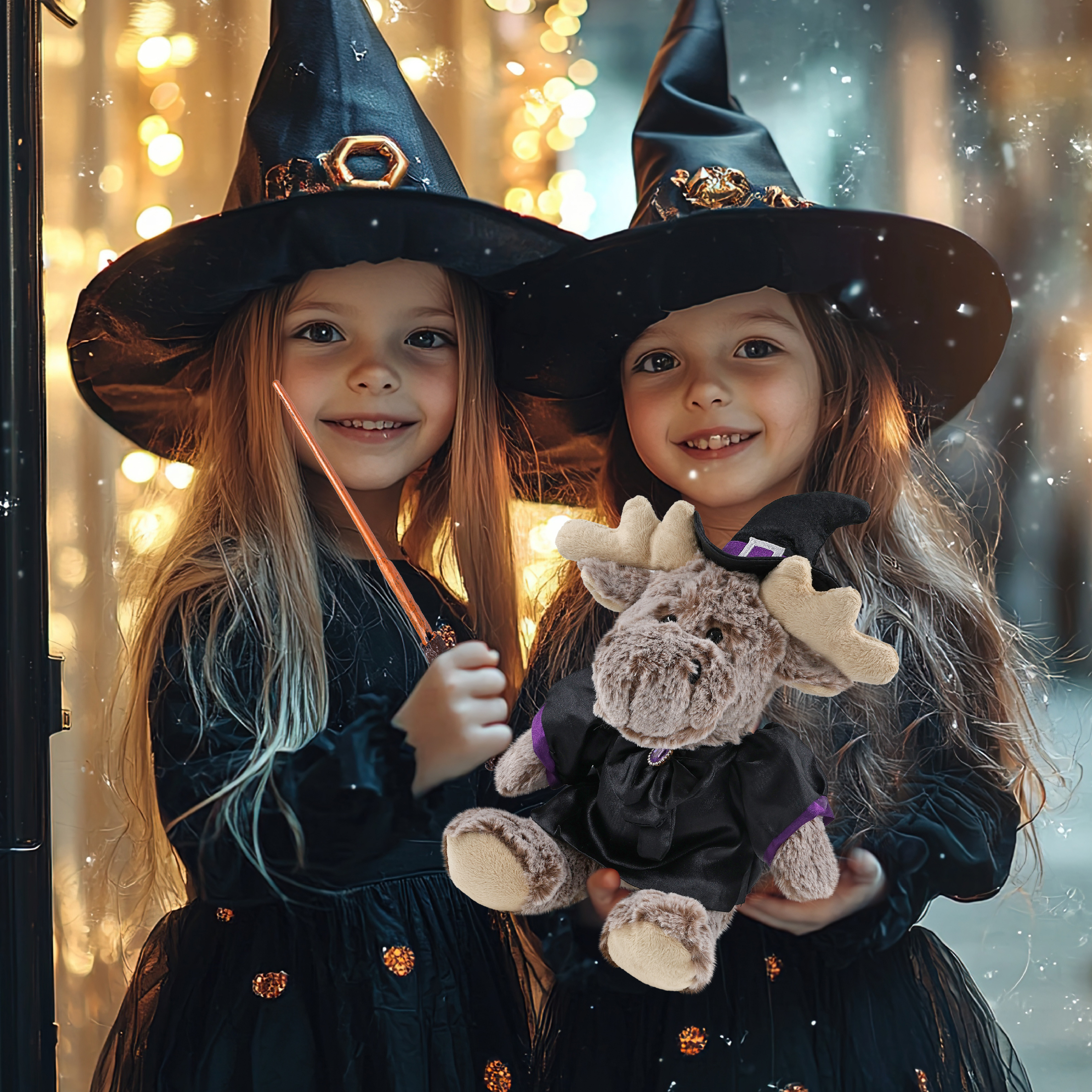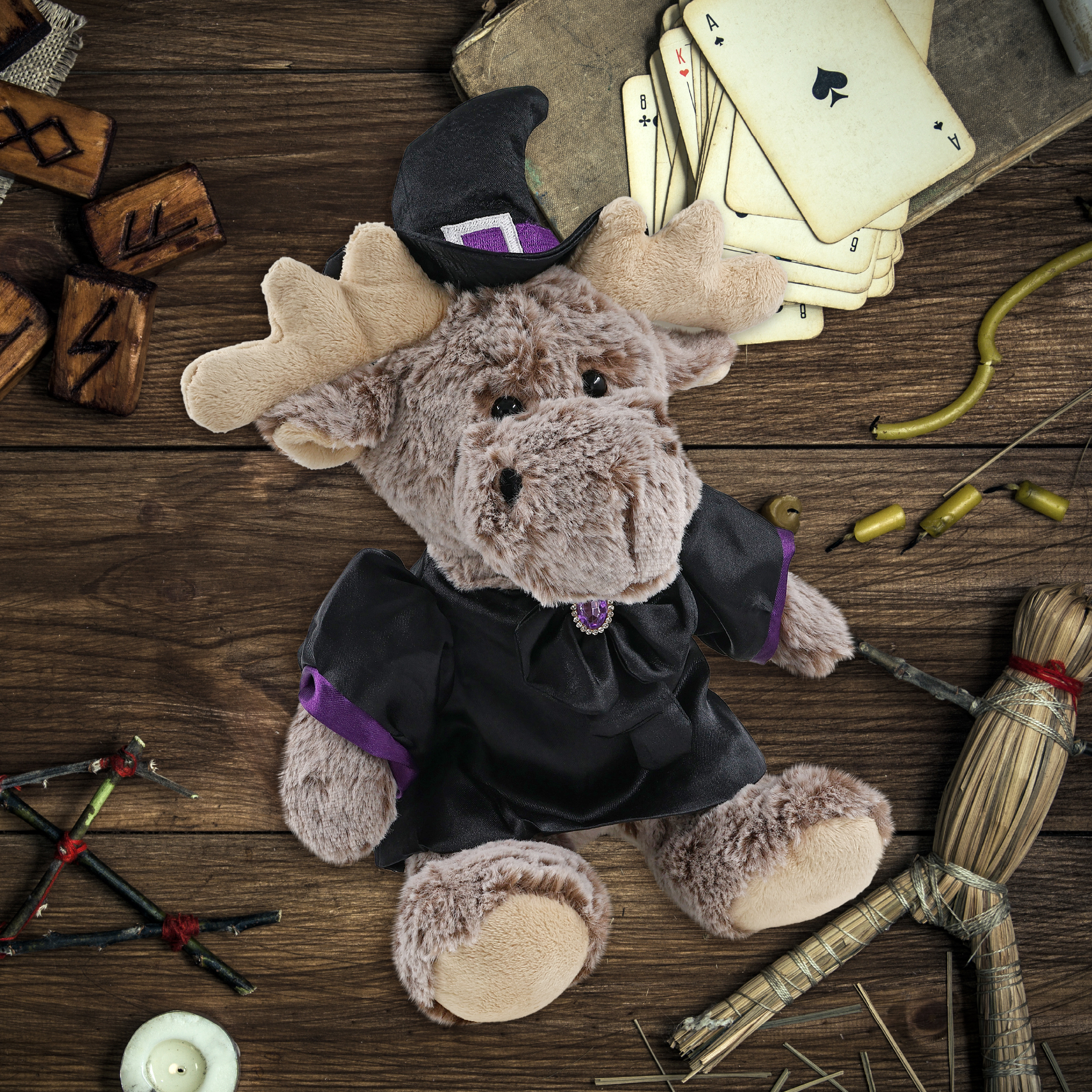 - Features a Teddy Bear Halloween Plush Wearing Witch Plush Doll Clothes – This cute witch moose stuffed toy comes dressed in a soft black satin witch doll dress with purple trim and a shiny gem-accented bow. It also wears a pointy black witch hat decor with a silver buckle and purple band, completing the spooky Halloween teddy bear look. The moose plush toy witch costume is removable and fits snugly on the moose Halloween witch doll.