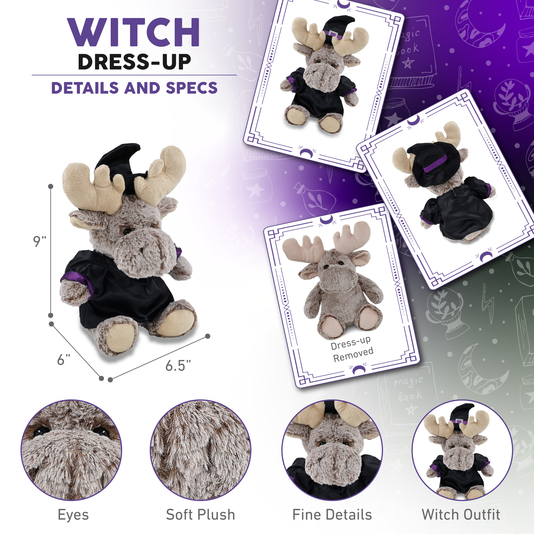- Includes 1 DolliBu Sitting Moose Toy Dressed in Witch Costume – The plush teddy bear arrives with a witch stuffed animal costume. The witch stuffed moose toy features a black witch dress up set with intricate purple details and black bow with gem. The perfect teddy bear plush to add spooky vibes to a display, along with your other Halloween stuffed animals. A cute stuffed animal for anyone ages 3 and up who is looking for a cute moose figure.