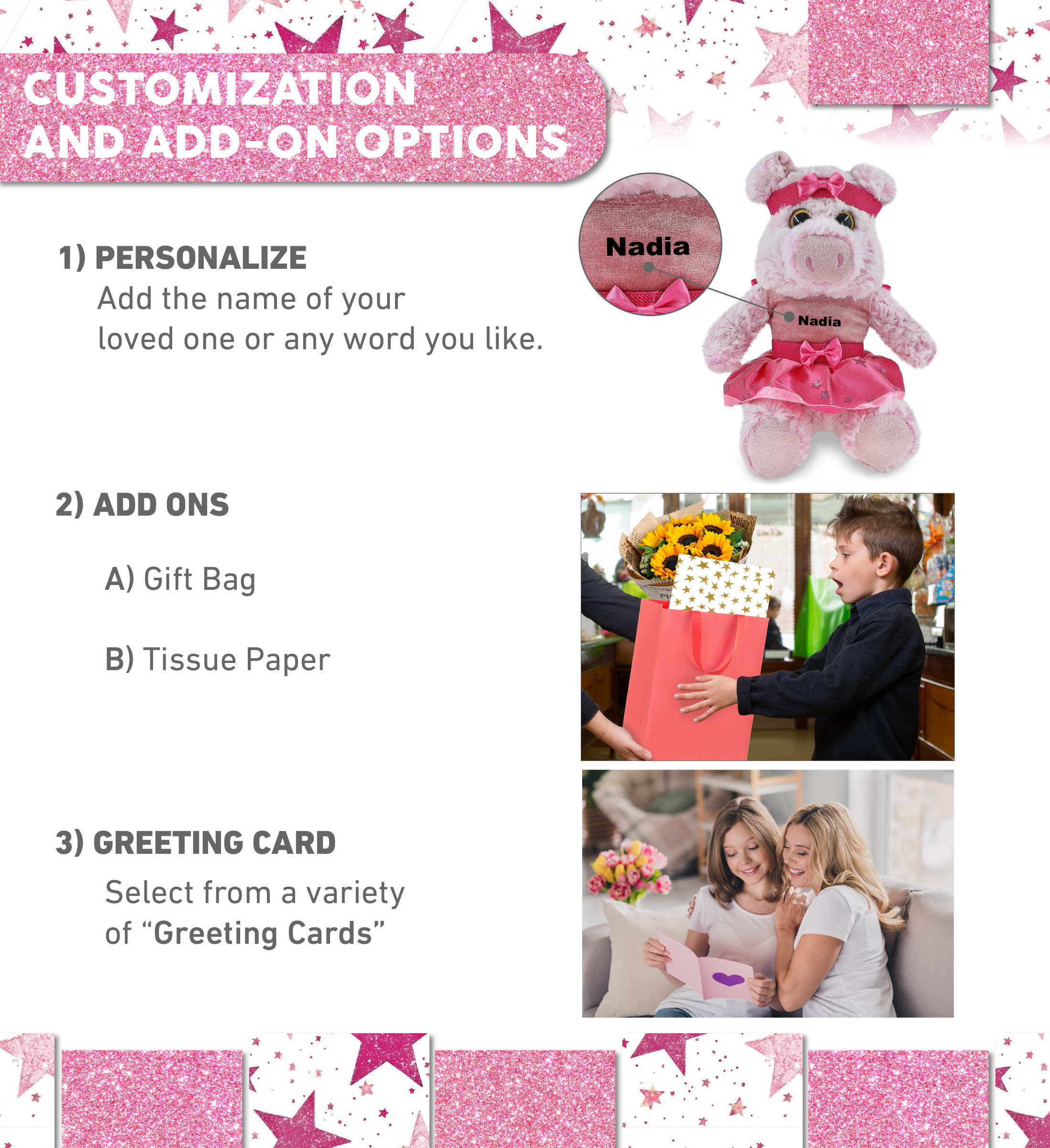 - Personalization, Customization, and Add-On Options – The sitting pig stuffed animal plush comes dressed in a pink ballerina outfit, complete with tutu skirt, headband, and shirt. Make it meaningful by personalizing it with the name, which we will imprint directly onto the plush. You can also customize your ballerina pig stuffed animal doll by adding any of our add-ons to create the perfect gift: 1) Gift Bag 2) Tissue Paper 3) Greeting Card.