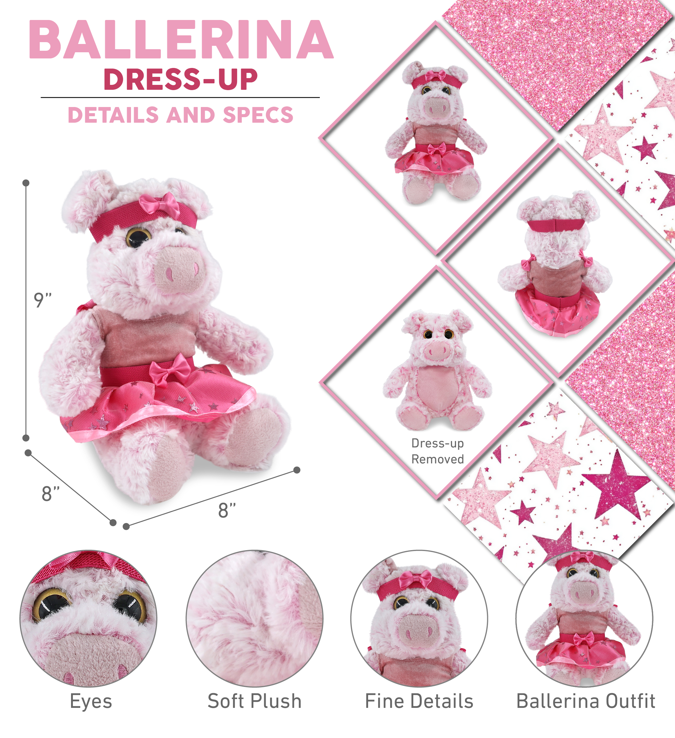 - Sitting Pig with Ballet Stuffed Animal Clothes Features a Unique Combination of Farm Life and Ballet – This pig plush ballet doll is wearing pink ballerina plush doll clothes. Perfect gift for ballerinas and dancers. The stuffed teddy bear features a soft plush and a set of ballet plush clothes, with a pink ribbon headband, tutu skirt, and a sleeveless top, making it a soft stuffed animal ballerina pig toy little dancers will enjoy.
