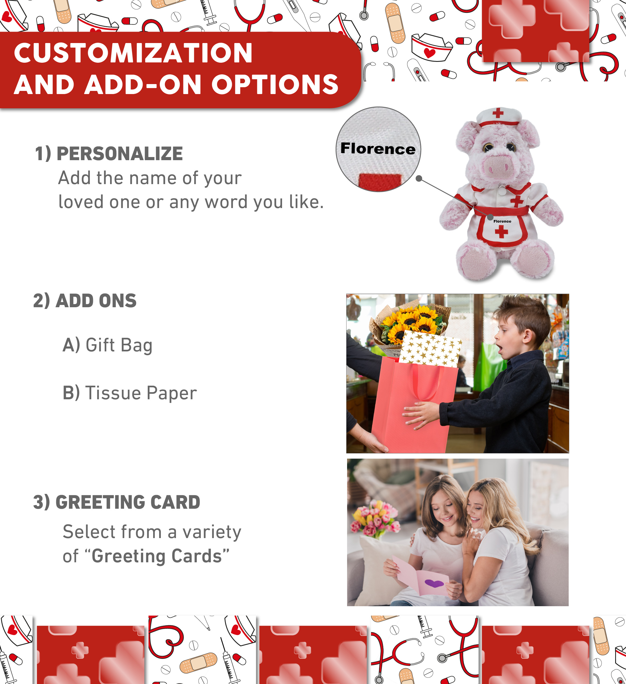 - Personalization, Customization, and Add-On Options – The stuffed pig comes dressed in a cute nurse costume, complete with nurse cap, nurse dress, and apron. Make your nurse teddy bear stuffed animal plush special by adding a personalized name, which we’ll imprint onto the plush. You can also customize your nurse pig plush by adding any of our add-ons to create the perfect gift: 1) Gift Bag 2) Tissue Paper 3) Greeting Card.
