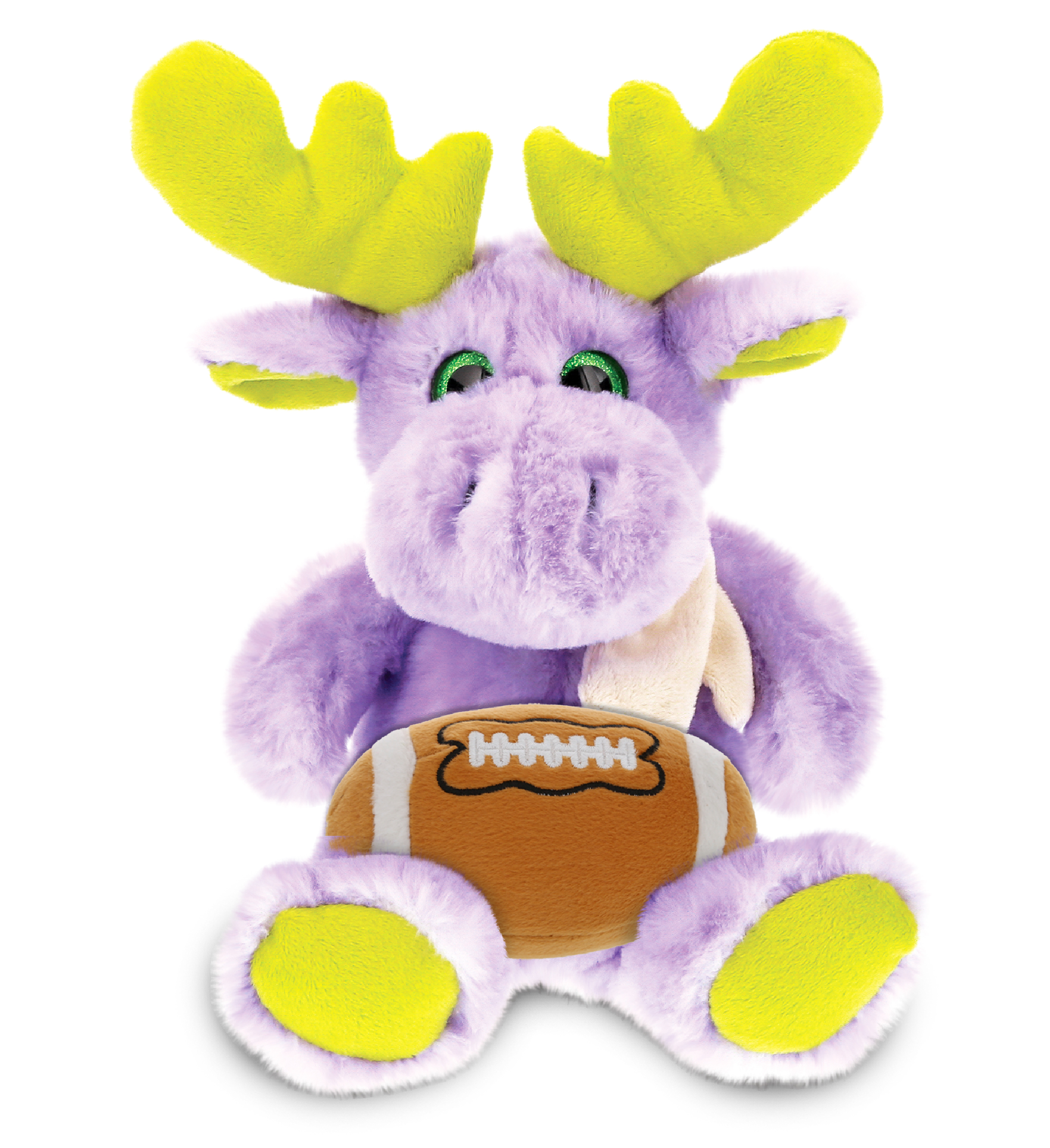 - Personalization, Customization, and Add-On Options – This Super Soft Sports Stuffed Animal Sitting Purple Moose with Scarf comes customized with a football plush. You can personalize it with the name of your loved one imprinted on the item. You also have the option to add some or all of the cool add-ons to make your gift extra special: 1) Gift Bag; 2) Tissue Paper; 3) Greeting Card.