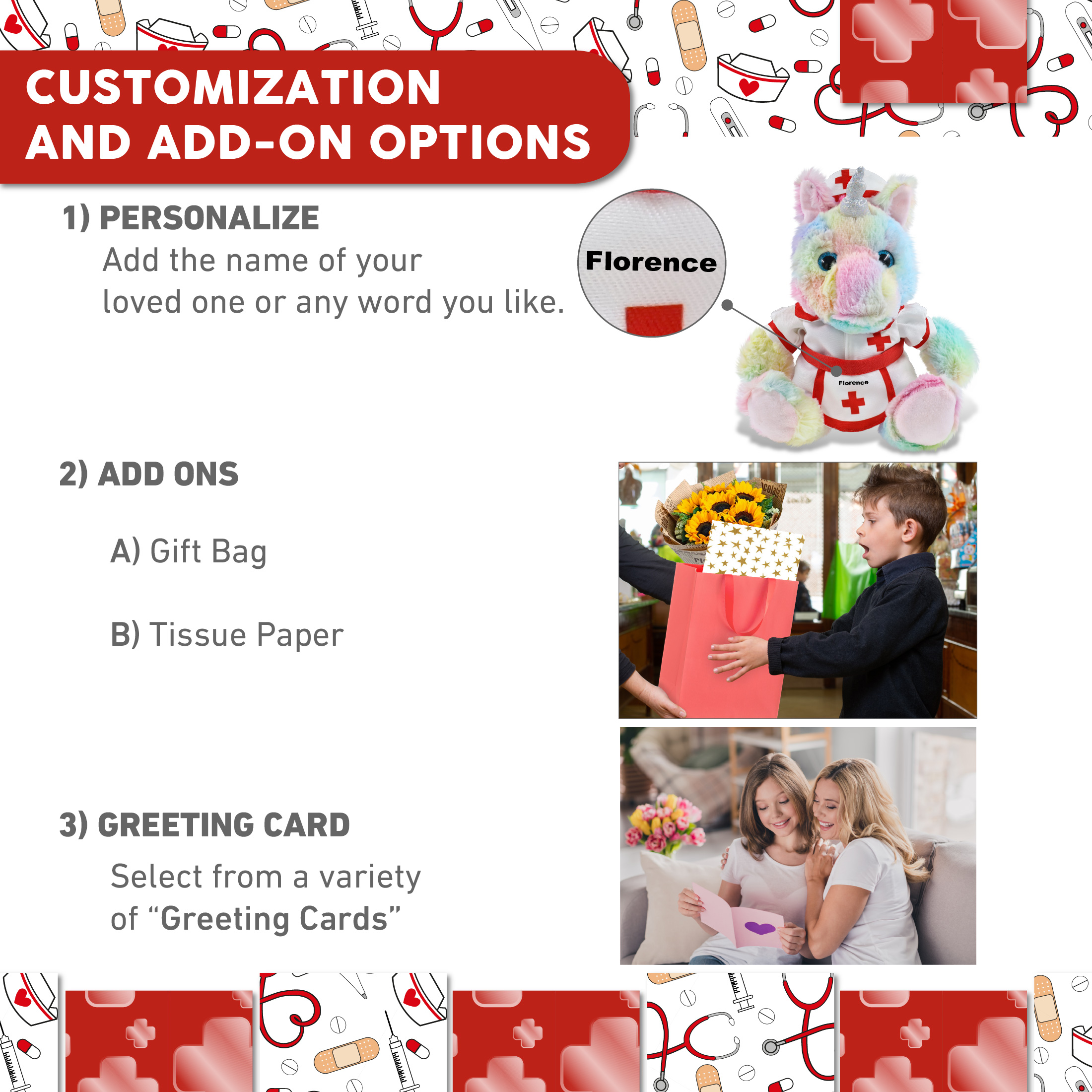 - Personalization, Customization, and Add-On Options – The stuffed Unicorn comes dressed in a cute nurse costume, complete with nurse cap, nurse dress and apron. Make your nurse teddy bear stuffed animal plush special by adding a personalized name, which we’ll imprint onto the plush. You can also customize your nurse unicorn plush by adding any of our add-ons to create the perfect gift: 1) Gift Bag 2) Tissue Paper 3) Greeting Card.