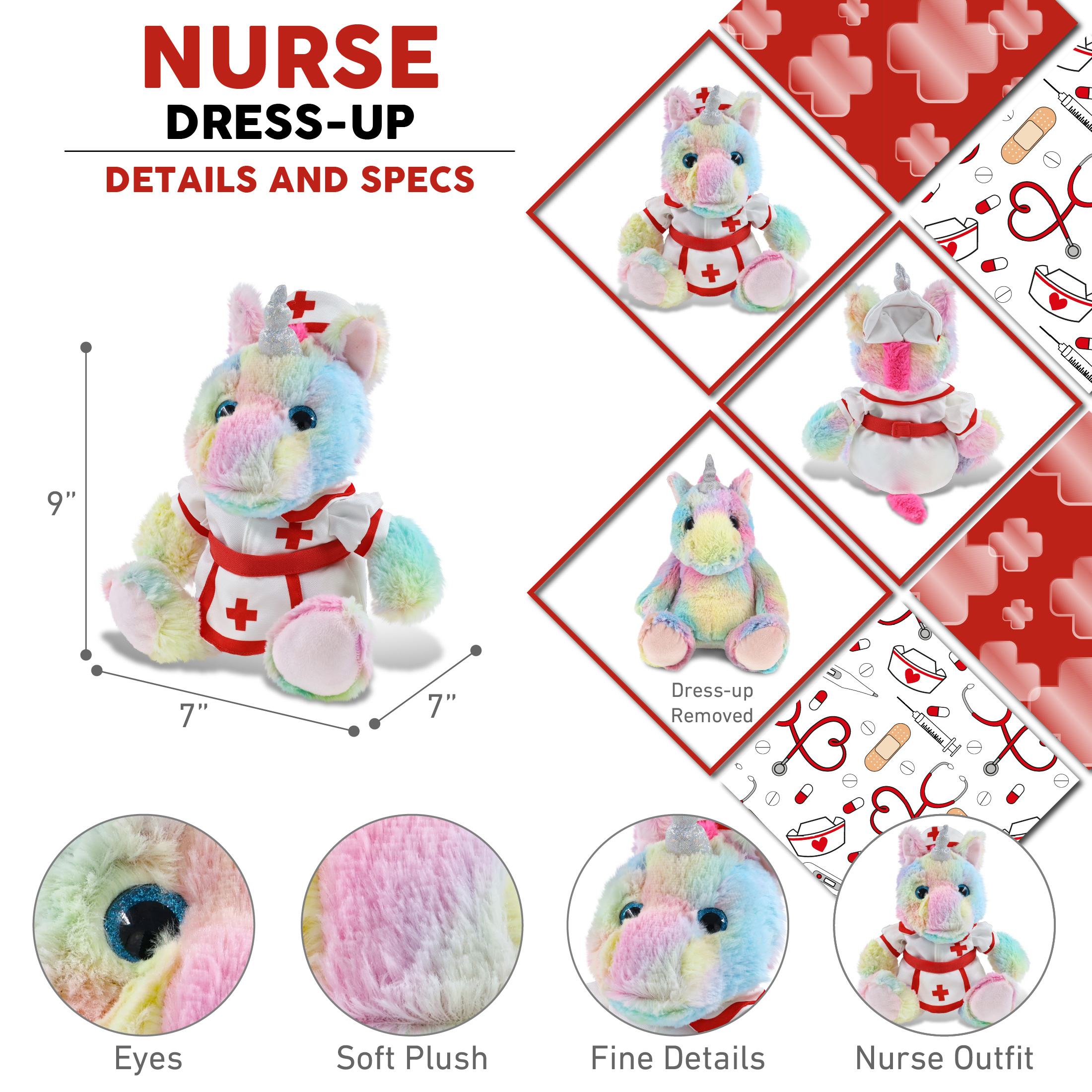 - Sitting Rainbow Unicorn with Nurse Stuffed Animal Clothes Features a Classic Nurse Outfit – Designed with red lining and a cross against the white nurse dress and the nurse cap and apron. The unicorn stuffed animal plush has soft plush, perfect for everyday snuggles. This stuffed animal with clothes makes the perfect addition to your collection of unicorn teddy bear with clothes or giveaway hospital toys to give to sick children.