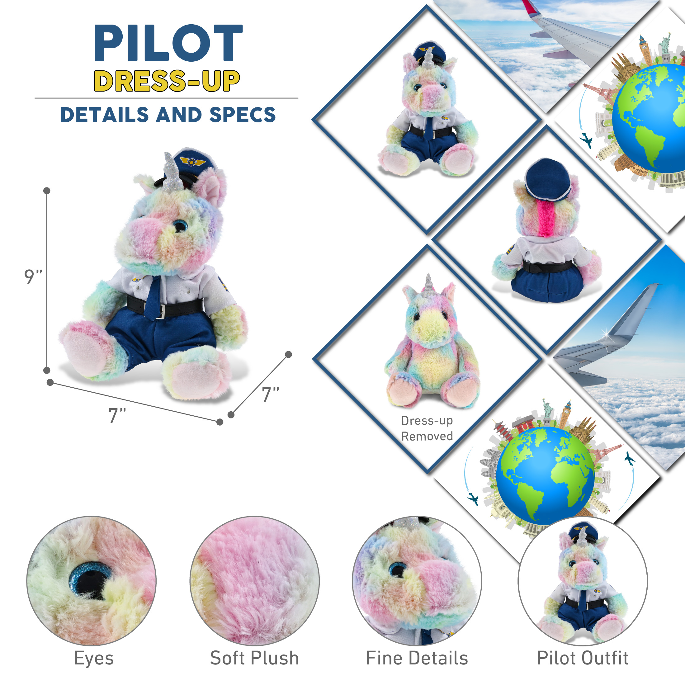 DolliBu Sitting Rainbow Unicorn Stuffed Animal with Pilot Costume and Name Personalization – Cute Fantasy Plush Toy with Airplane Aviation Uniform Dress Up – 9 Inches