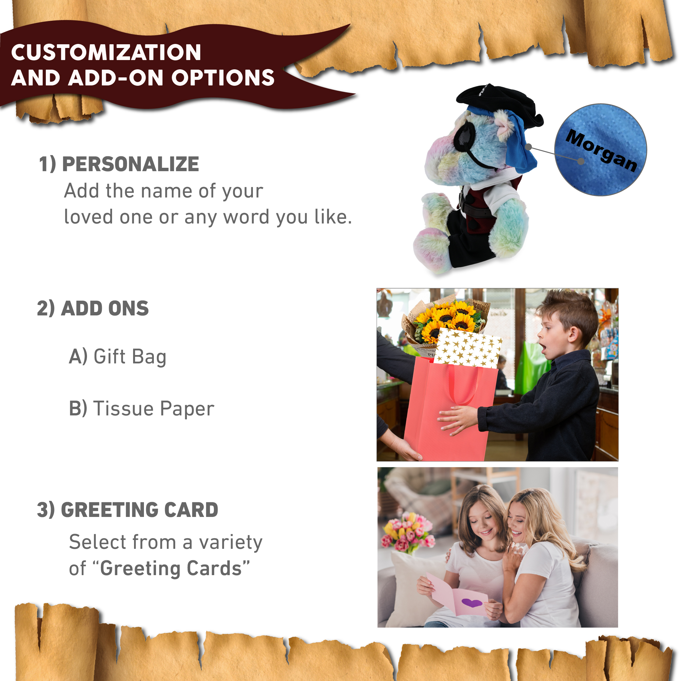 - Personalization, Customization, and Add-On Options – The unicorn figure stuffed toy comes dressed in full pirate clothes, complete with pirate hat, pirate vest, pirate shirt, pants, belt, and pirate mask. Make your bear doll special by adding a personalized name, which we will imprint onto the plush. You can also customize your stuffed animal by adding any of our add-ons to create the perfect gift: 1) Gift Bag 2) Tissue Paper 3) Greeting Card.