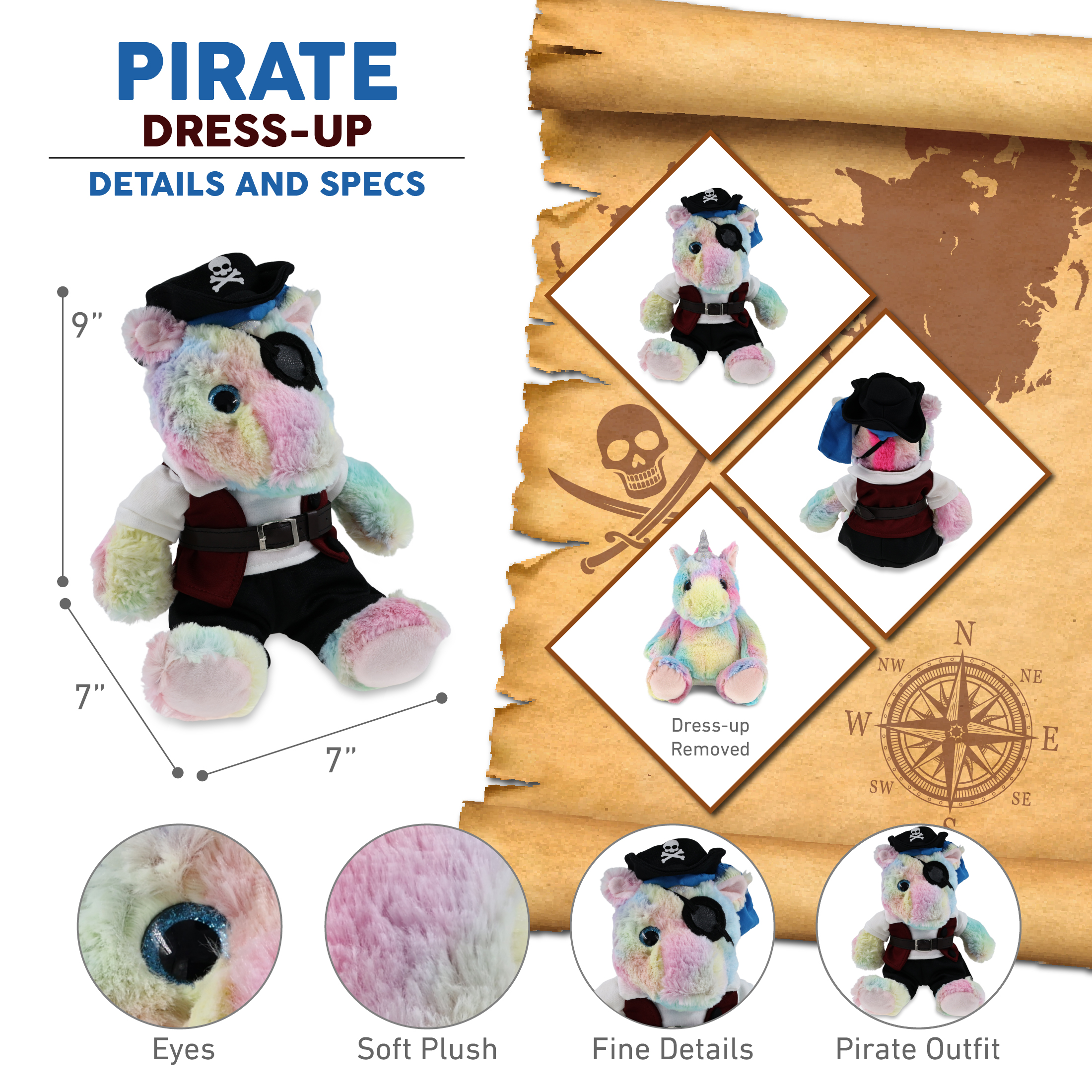 - Includes 1 DolliBu Sitting Rainbow Unicorn Stuffed Toy with Pirate Outfit – The unicorn toy wears a pirate teddy bear costume featuring a pirate vest, belt, shirt, pants, and pirate hat. Whether you’re collecting unicorn toys or hunting for pirate stuff for kids, this plush is the perfect combo of silly plush fun and dress-up adventure. This cute pirate stuffed animal unicorn measures approximately 7Lx7Wx9H inches and is for kids ages 3 and up.