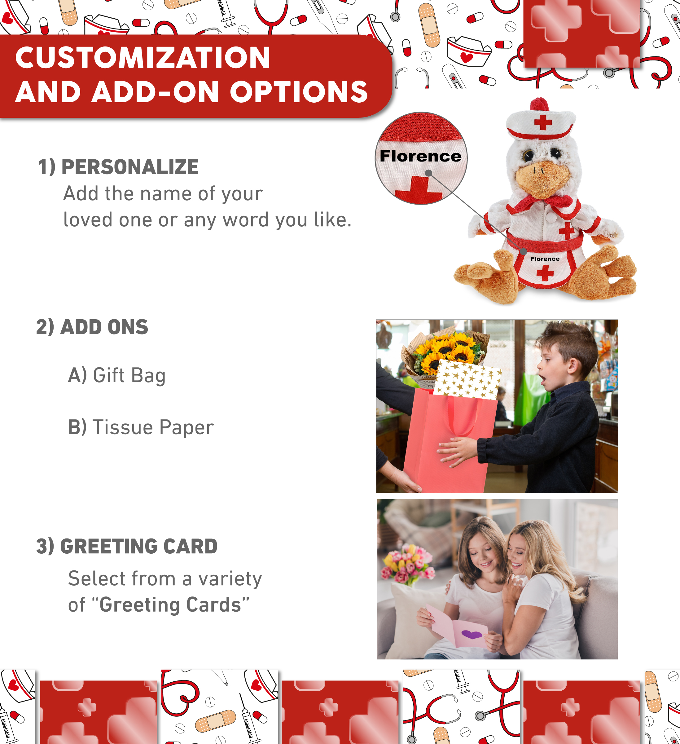 - Personalization, Customization, and Add-On Options – The stuffed Rooster comes dressed in a cute nurse costume, complete with nurse cap, nurse dress and apron. Make your nurse teddy bear stuffed animal plush special by adding a personalized name, which we’ll imprint onto the plush. You can also customize your nurse rooster plush by adding any of our add-ons to create the perfect gift: 1) Gift Bag 2) Tissue Paper 3) Greeting Card.