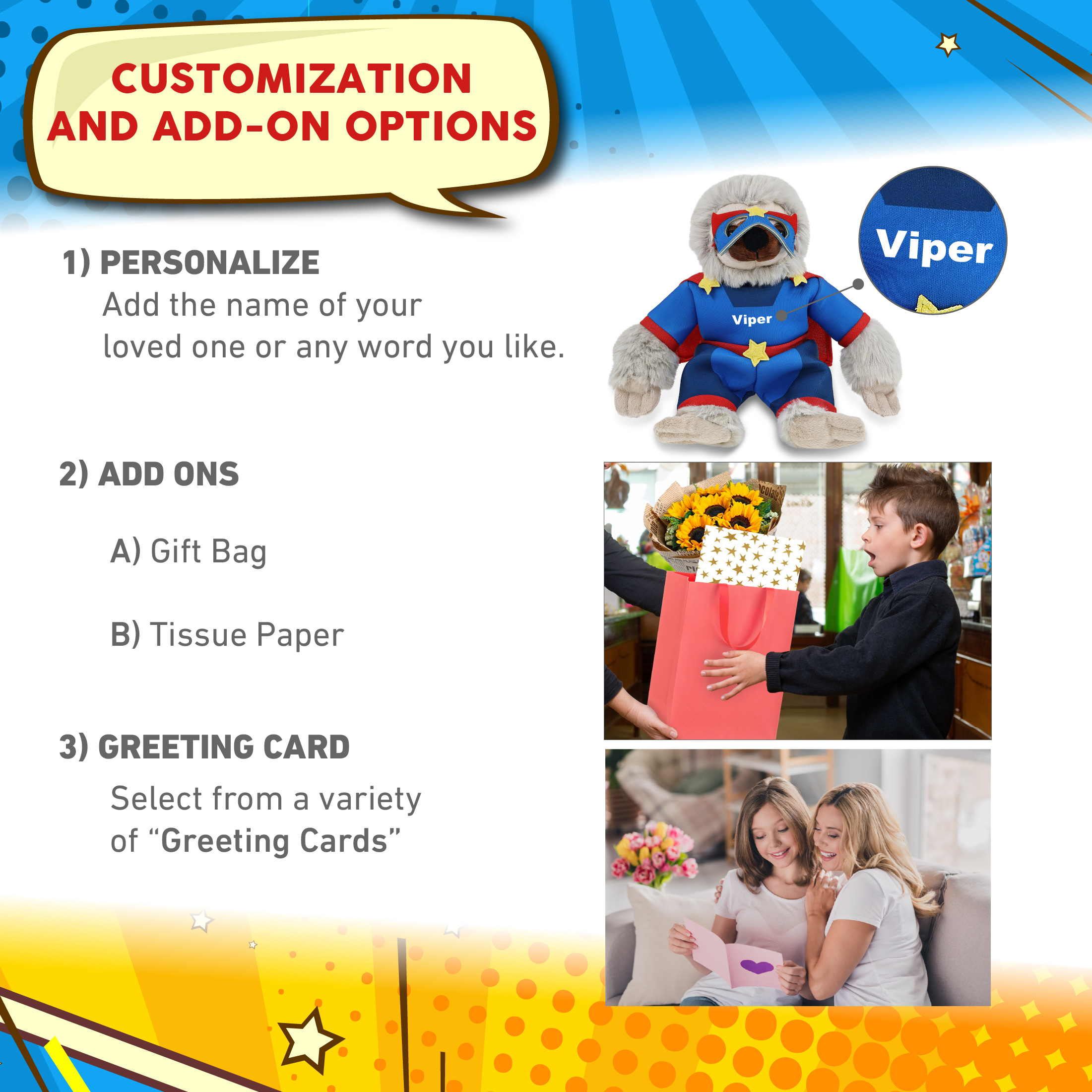 - Personalization, Customization, and Add-On Options – The sloth stuffed animal comes dressed in a full superhero outfit, complete with eye mask, suit with cape, and star details. Make your super hero sloth toy special by adding a personalized name, which we will imprint onto the plush. You can also customize your plush hero toy by adding any of our add-ons to create the perfect gift: 1) Gift Bag 2) Tissue Paper 3) Greeting Card.