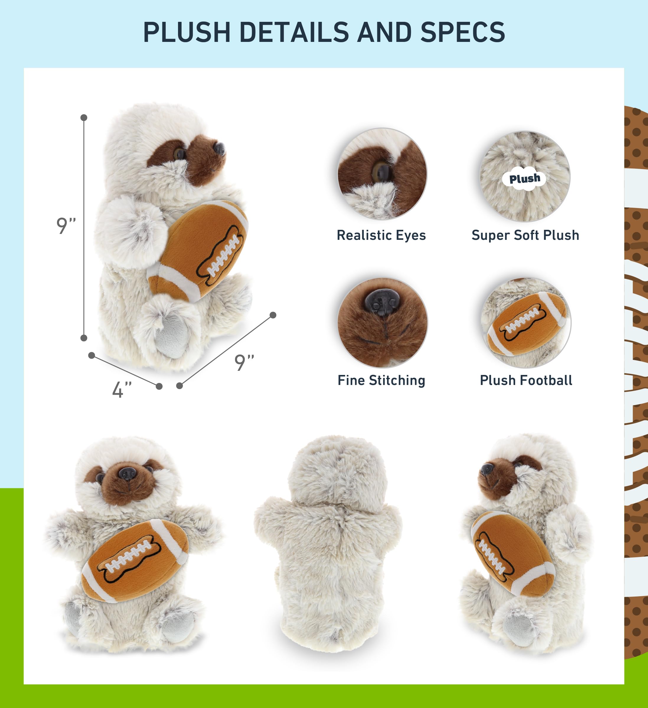 - Included with the Purchase of Adorable Cute Sloth Plush – Includes 1 DolliBu Super Soft Sloth Hand Puppet with a football plush, decorated with realistic features of a cute sloth. The body with a sports gift ball plush makes the plush perfect for cuddles. The sloth plush toy features its iconic snout. The sloth’s eyes make the critter so charming. The cute sloth plush toy buddy measures 9Lx9Wx4.5H inches.
