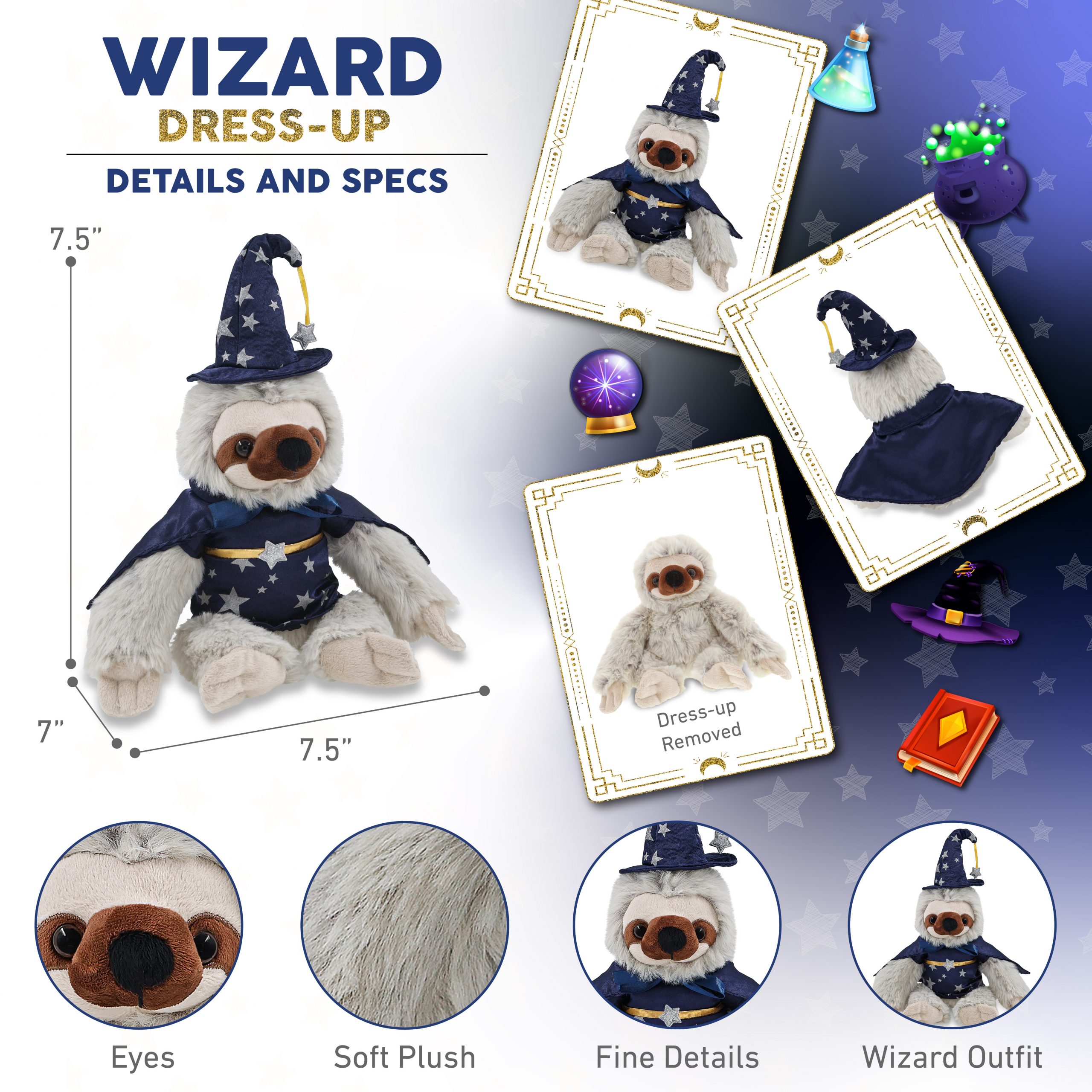 - Includes 1 DolliBu Sloth Toy with Wizard Stuffed Doll Clothes – This plush wild animal arrives in magical wizard sloth clothes. Dressed in a blue wizard robe and hat, this soft plush animal stands out in any wizard toy collection. It’s a great sloth gift for Halloween or birthdays. The wizard doll clothes can be easily dressed or undressed for dress-up play. This cute sloth plush wizard buddy measures 7.5Lx7Wx7.5H inches.
