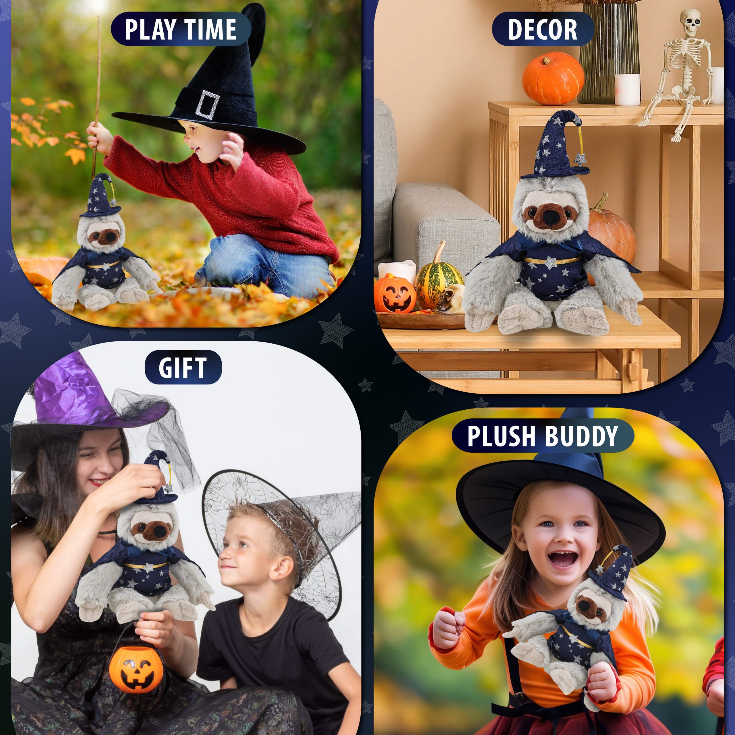 - Features a Cute Sloth Plush with Wizard Stuffed Animal Clothes – With a wizard cloak and wizard stuffed animal hat adorned with silver stars, this sloth Halloween stuffed animal has a playful and stylish magical look! The detailed wizard fantasy outfit adds character to your stuffed toys and makes them stand out among other cute sloth figures. Everyone will love to play with a huggable stuffed animal with wizard clothes for stuffed animals.