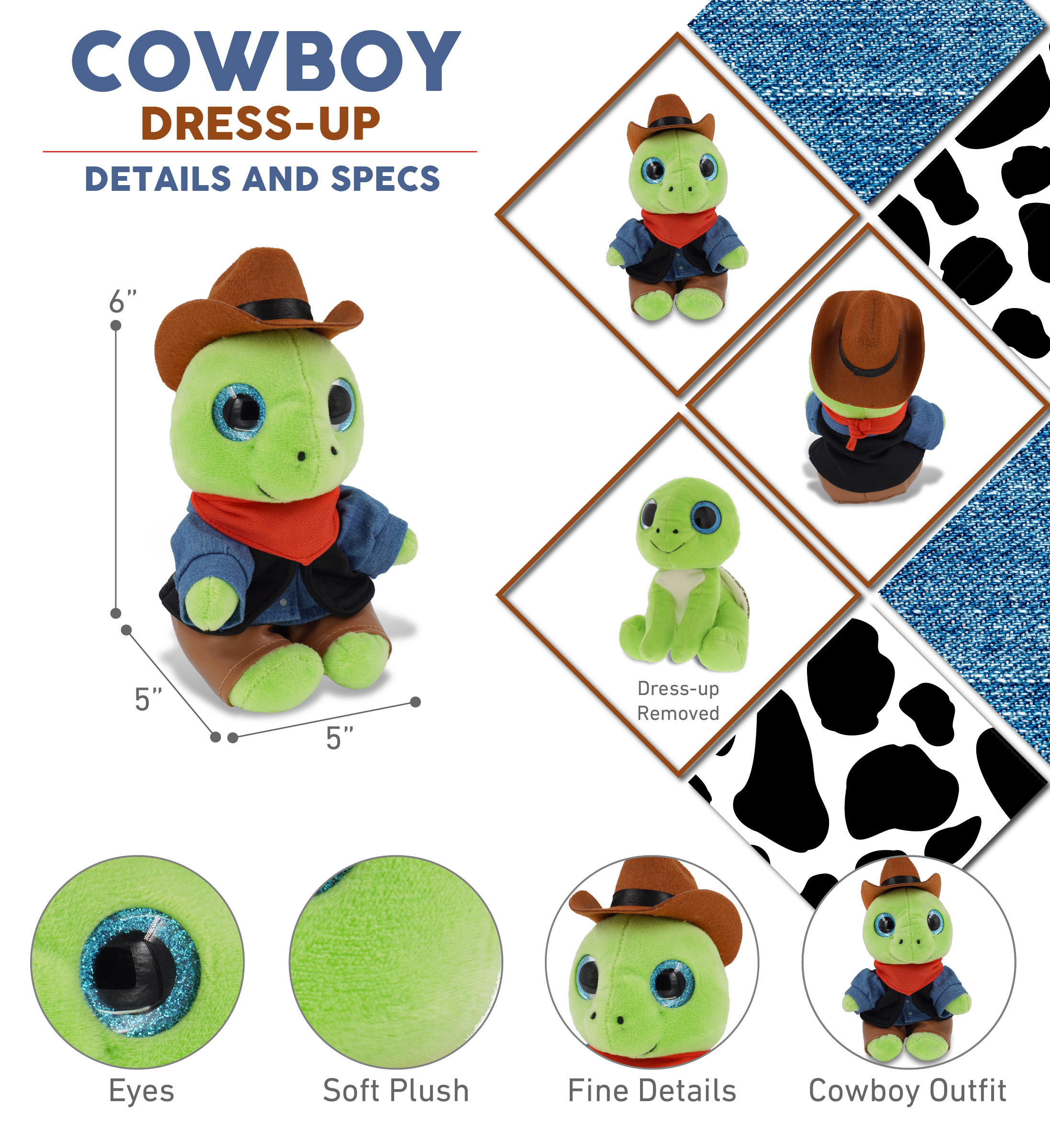 - Includes 1 DolliBu Sparkle Eyes Green Sea Turtle Toy with Cowboy Dress Up Set – This turtle plush arrives with cowboy plush clothes. The cute stuffed toy features a cowboy costume hat, vest costume shirt, red handkerchief, and brown chaps. Whether you collect stuffed animals or gifts for cowboys with cowboy stuffed animal clothes, this teddy bear plush toy is the perfect cowboy gift. It measures 5Lx5Wx6H inches and is best for kids ages 3 and up.