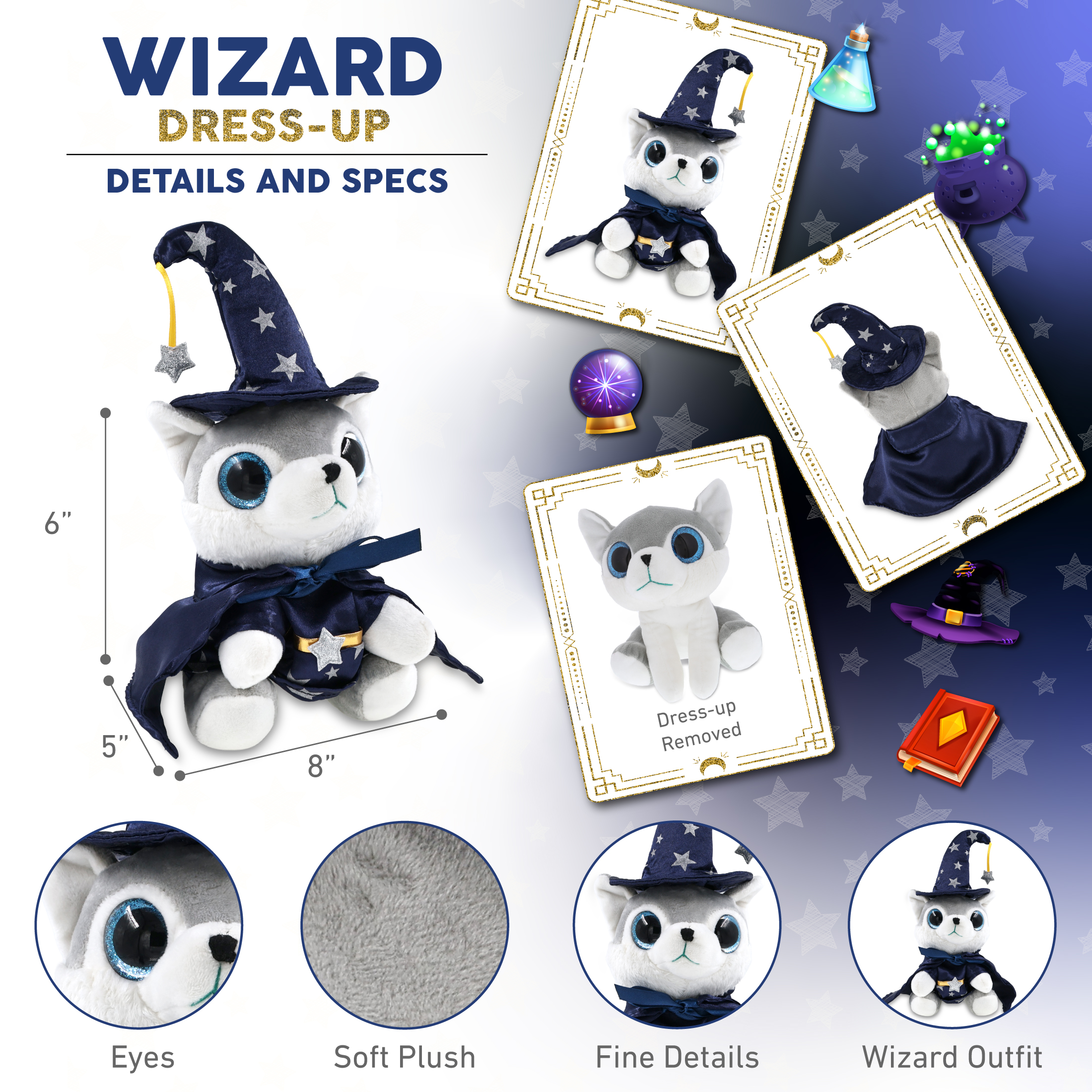 - Includes 1 DolliBu Sparkle Eyes Small Wolf Toy with Wizard Stuffed Animal Clothes – This wolf plush animal arrives in magical wizard wolf clothes. Dressed in a blue wizard robe and pointy hat, this wolf stands out in any plush toy collection. It’s a great gift for Halloween, birthdays, or magical pretend play. The wizard doll clothes can be easily dressed or undressed for dress-up play. This cute wolf plush wizard buddy measures 8Lx5Wx6H inches.
