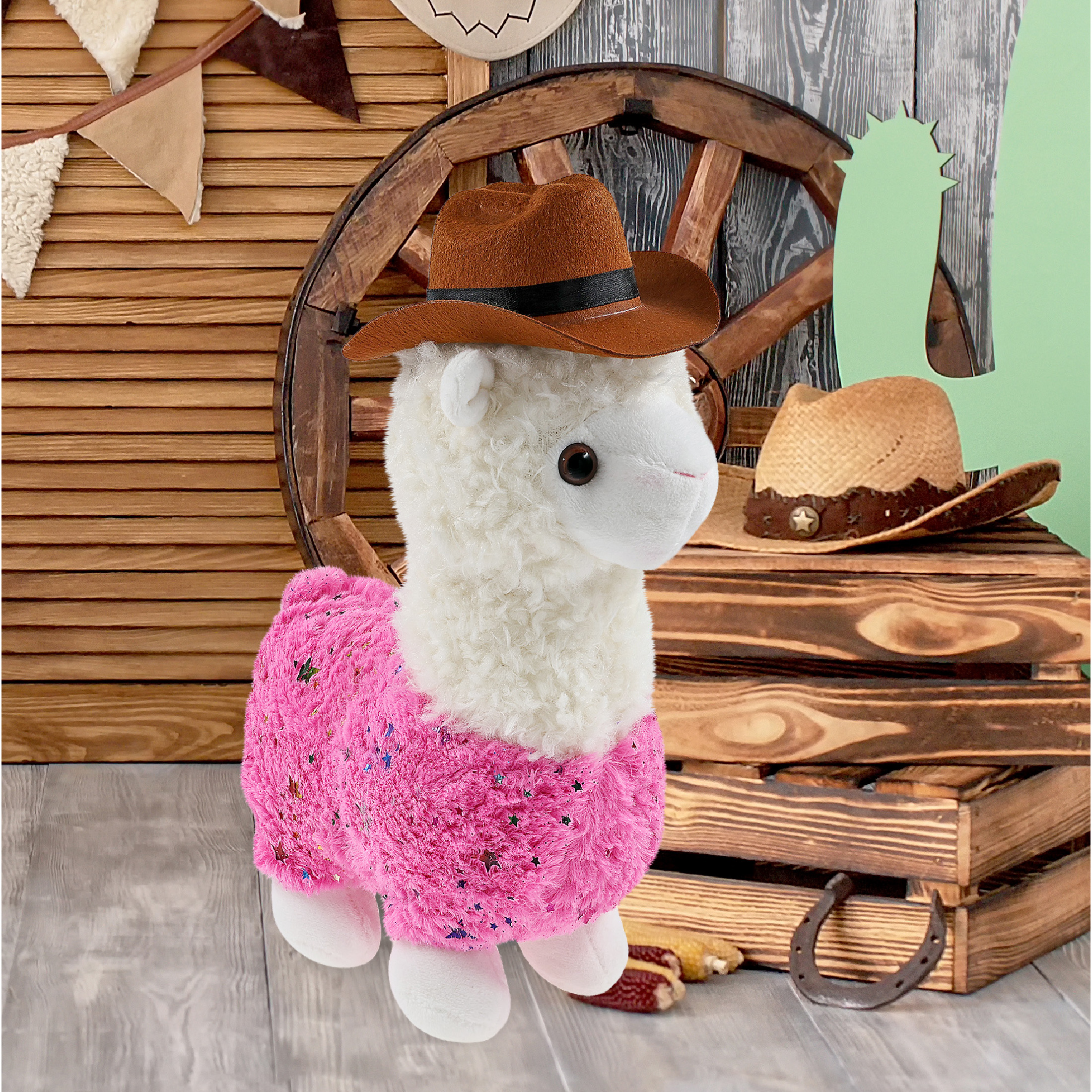 - Sparkle Eyes Pink Llama with Western Hat Features Realistic Details from its Cowboy Hat – With its doll cowboy hat, this pink llama figure rocks a look that’s both fun and stylish. The combo of llama toy and cowboy hat accessory creates two playful themes, farm and the Wild West. The plush pink llama with cowboy bear outfit hat makes the perfect addition to your collection of plush toys and cool stuffed animal clothing.