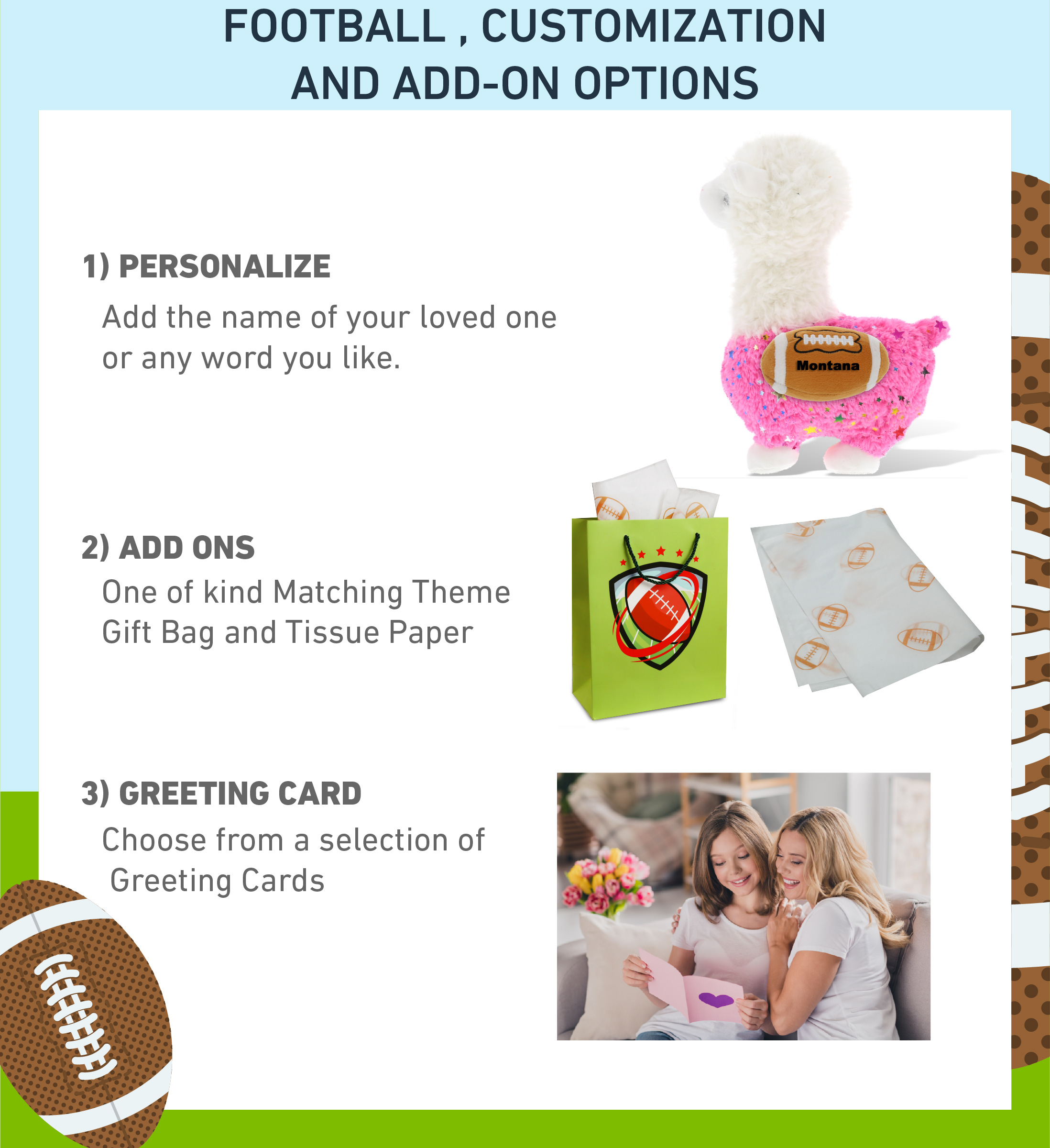 - PERSONALIZATION, CUSTOMIZATION, AND ADD-ON OPTIONS – The Super Soft Sports Stuffed Animal Sparkle Pink Llama comes customized with a Football Plush. You can personalize your pink llama plush toy with the name of your loved one imprinted on the item. You also have the option to add some or all of the cool add-ons to make your gift extra special: 1) Gift Bag; 2) Tissue Paper; 3) Greeting Card.