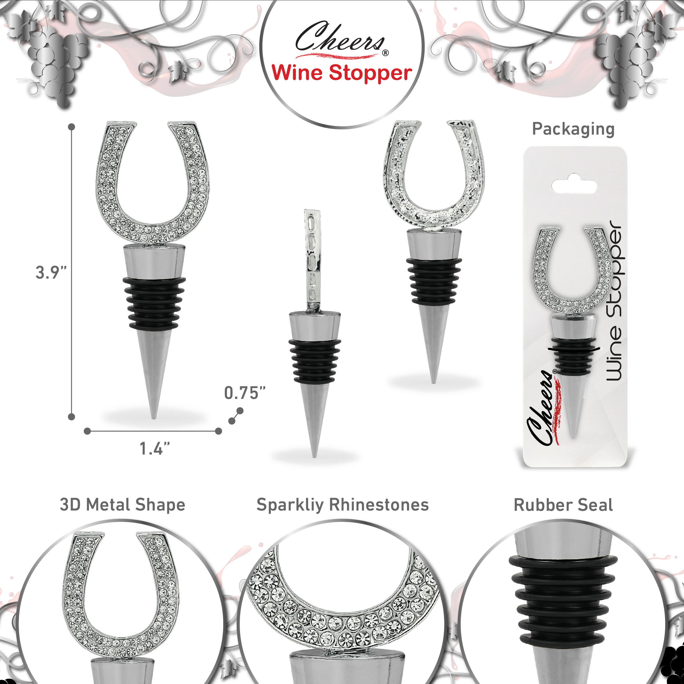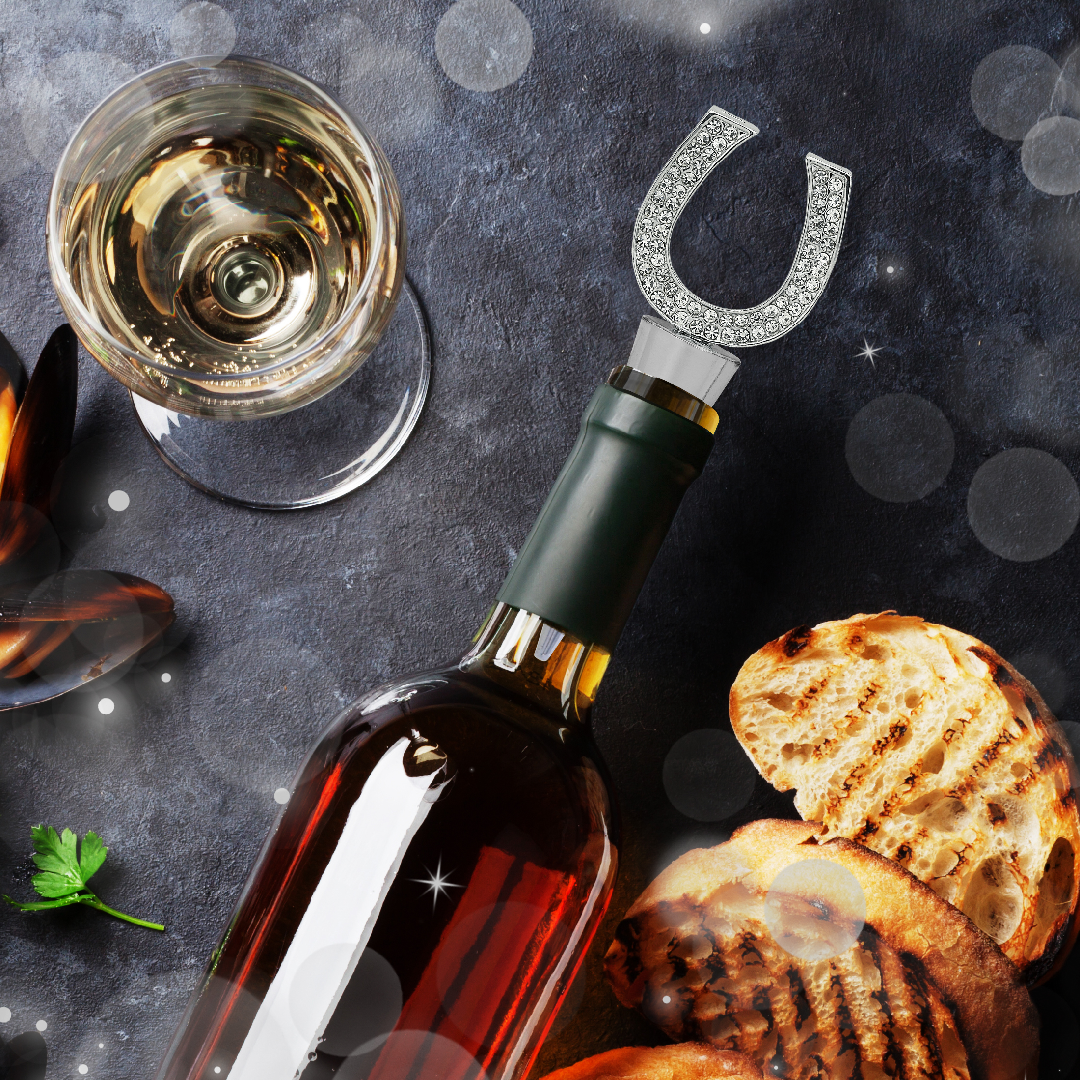 - Features Sparkling Wine Bottle Stopper with Rhinestone Crystals – This elegant horse shoe stopper is adorned with shimmering clear rhinestones, making it a standout crystal wine stopper. It transforms ordinary bottles into a statement conversation starter by creating an enhanced wine bottle decor. The silver horse shoe decorative wine bottle stopper is perfect for daily use or parties. A reusable wine bottle stopper to keep your wines fresh.