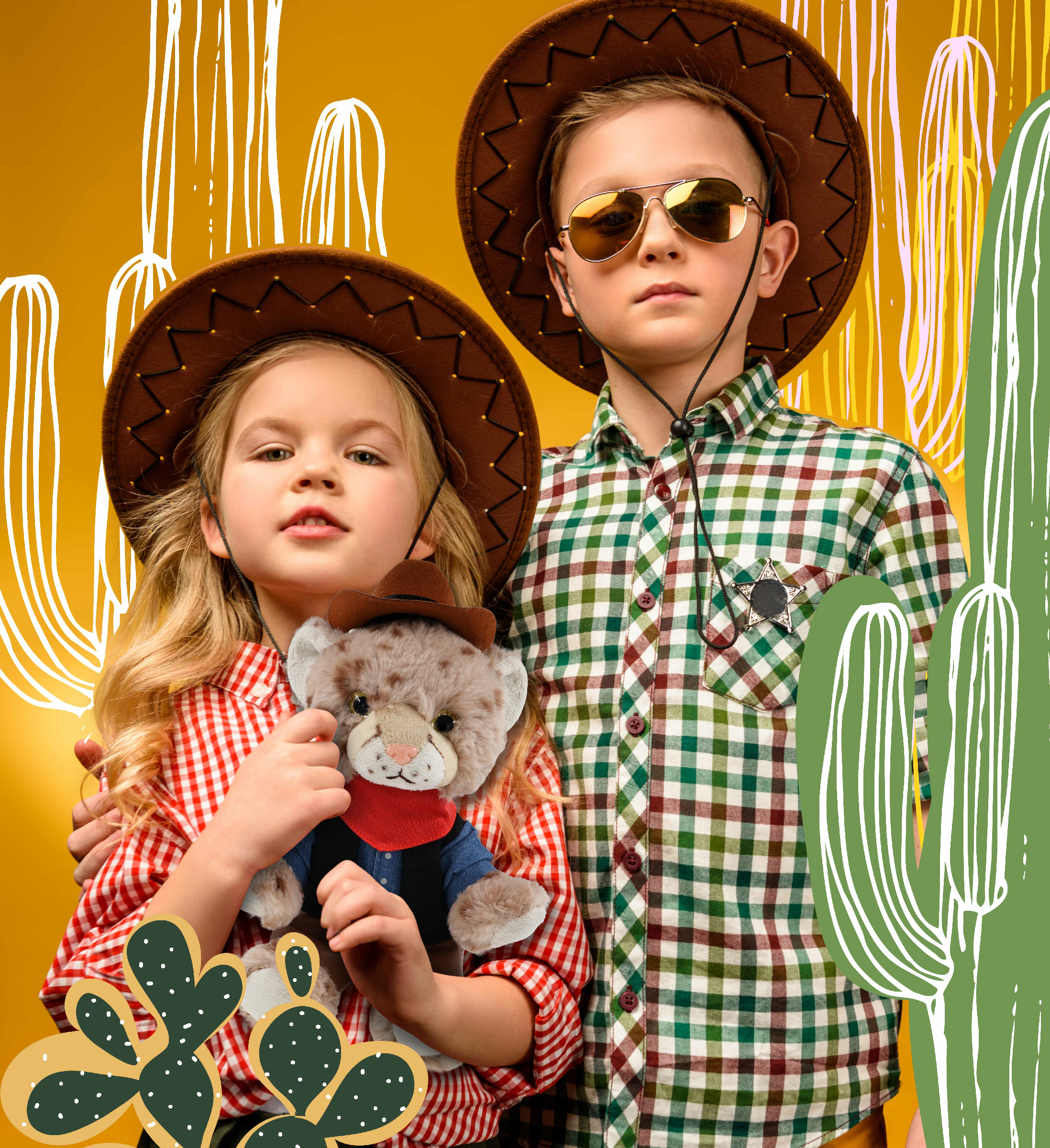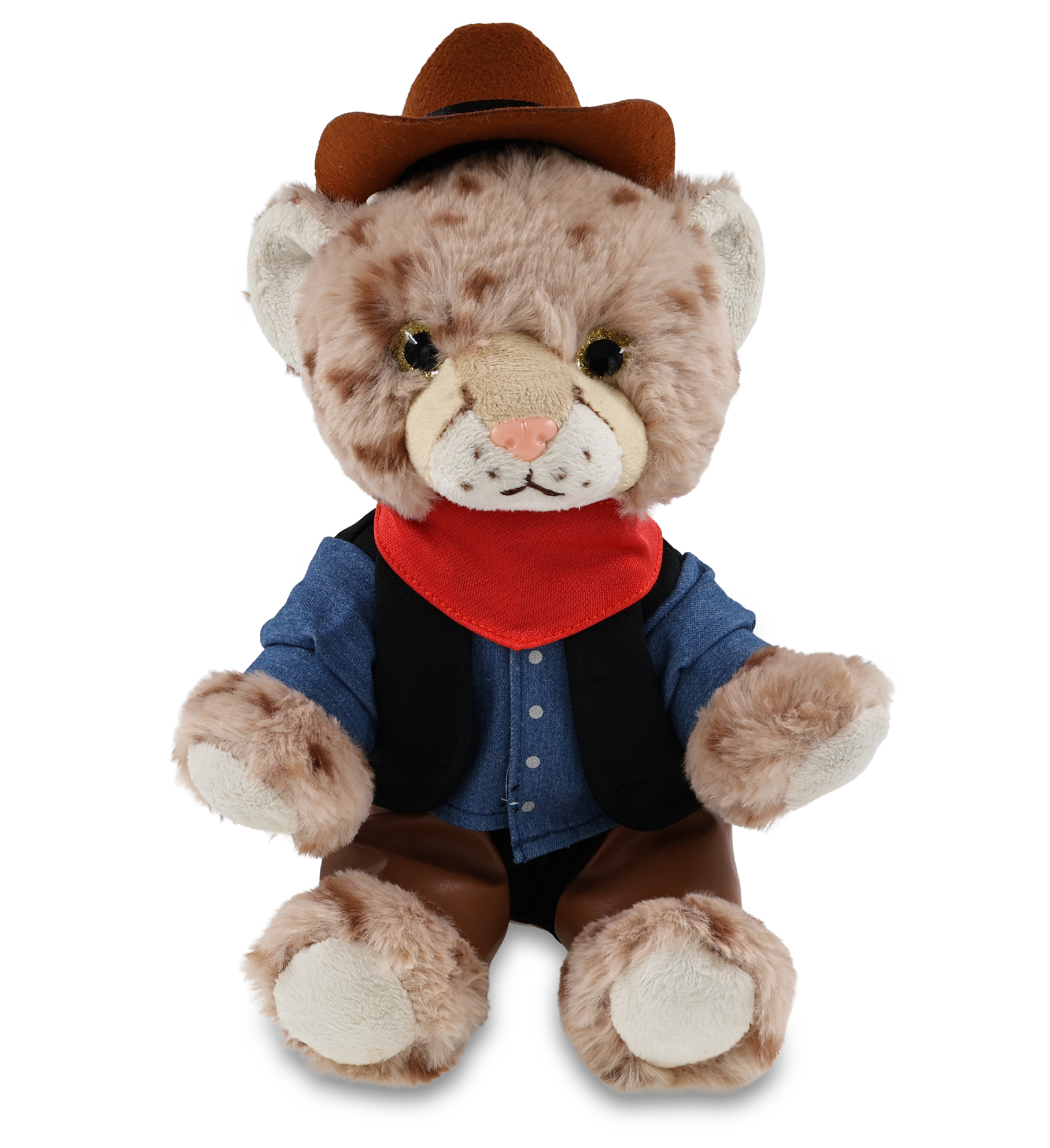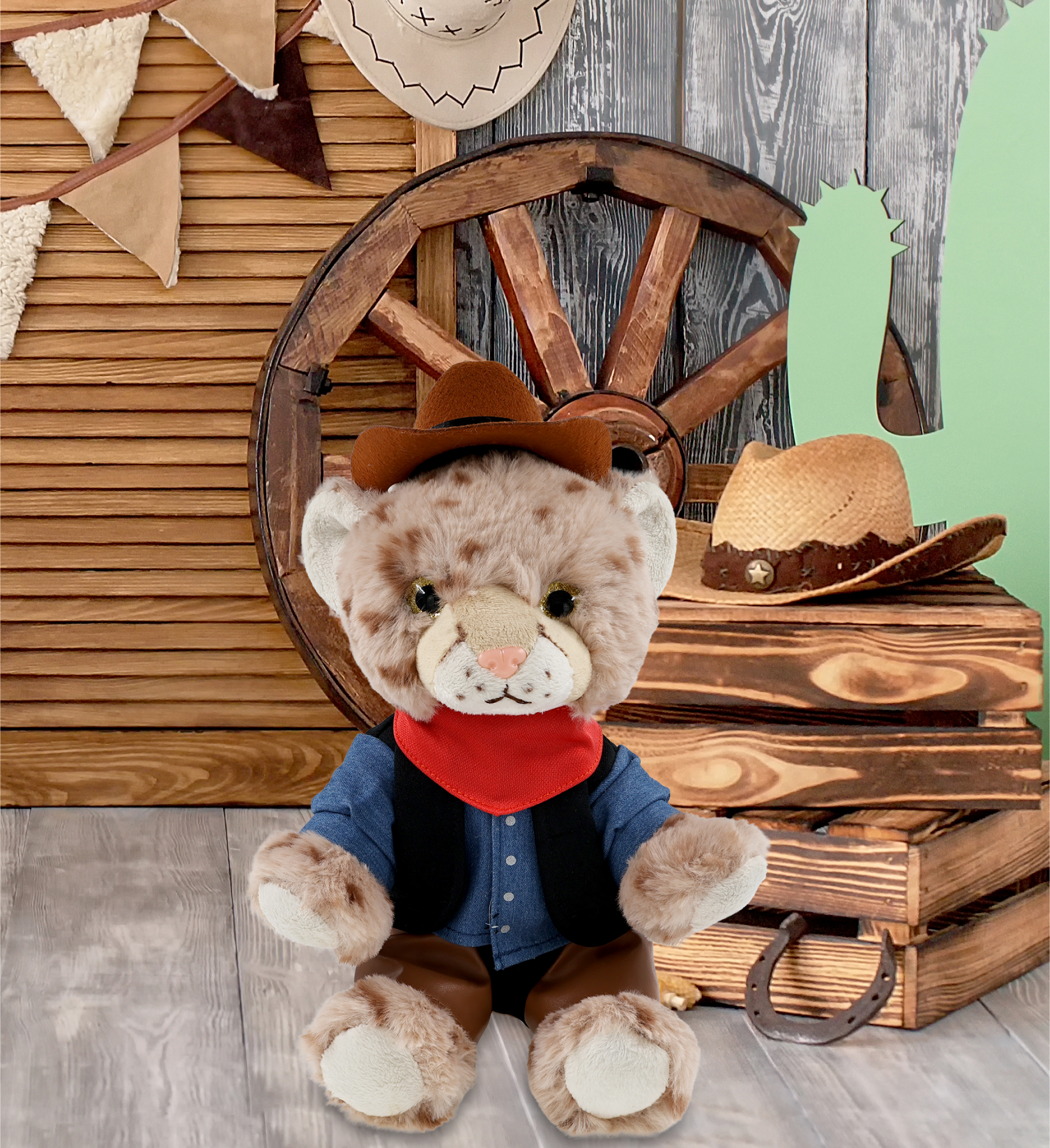 - Squat Cheetah with Western Outfit Features Realistic Details from its Cowboy Hat to Leather Chaps – From its doll cowboy hat to detailed western outfit, this cheetah figure rocks a look that’s both fun and stylish. The combo of cheetah toy and cowboy accessories creates two playful themes, wildlife and the Wild West. The plush with cowboy bear outfit makes the perfect addition to your collection of plush toys and cool stuffed animal clothing.