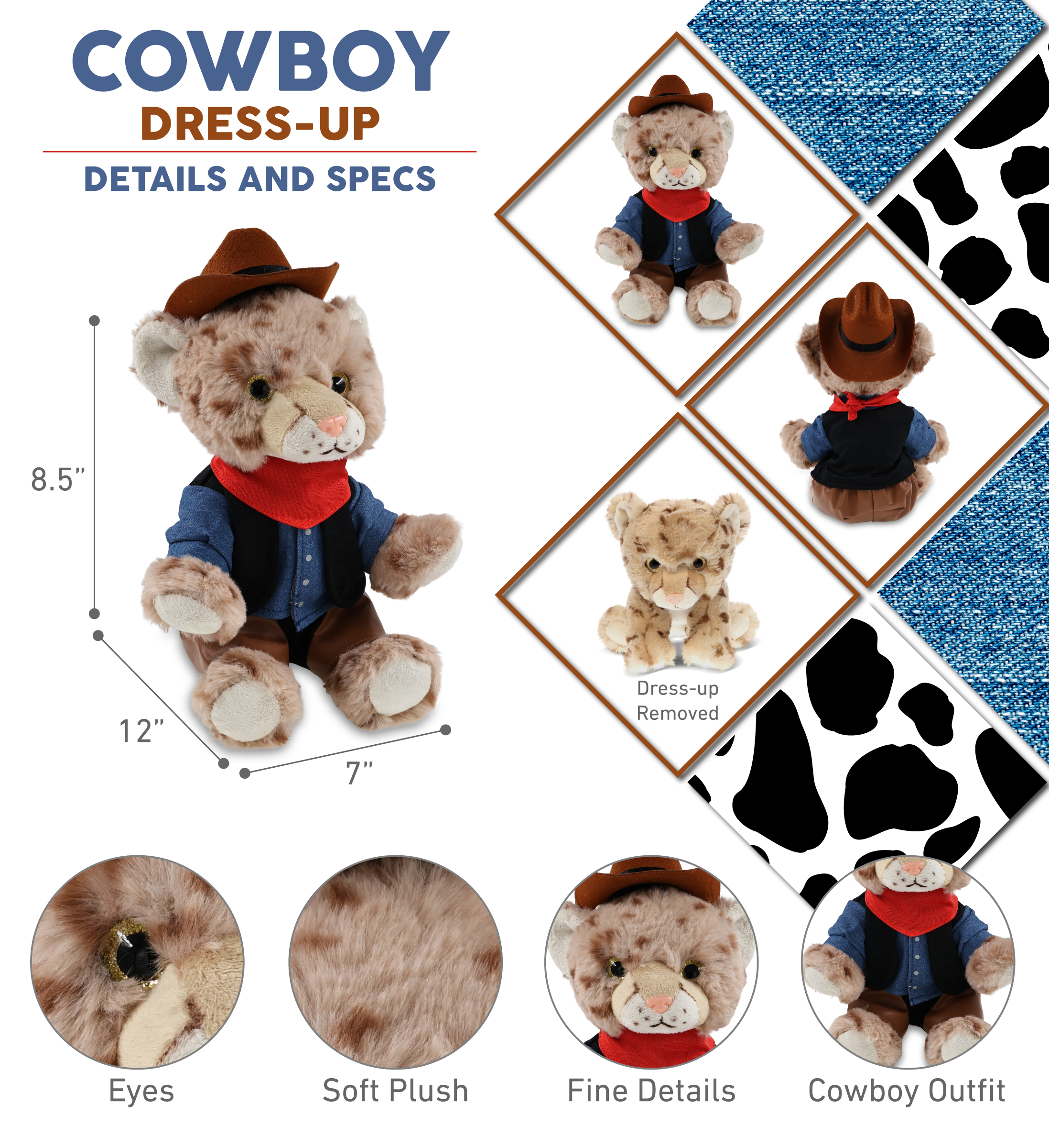 - Includes 1 DolliBu Squat Cheetah Toy with Cowboy Dress Up Set – This cheetah plush arrives with western cowboy plush clothes. The stuffed toy features a cowboy costume hat, vest costume shirt, red handkerchief, and brown chaps. Whether you collect adorable stuffed animals or gifts for cowboys with cowboy stuffed animal clothes, this teddy bear plush toy is the perfect cowboy gift. It measures 12.5Lx8.5Wx7H inches and is for kids ages 3 and up.