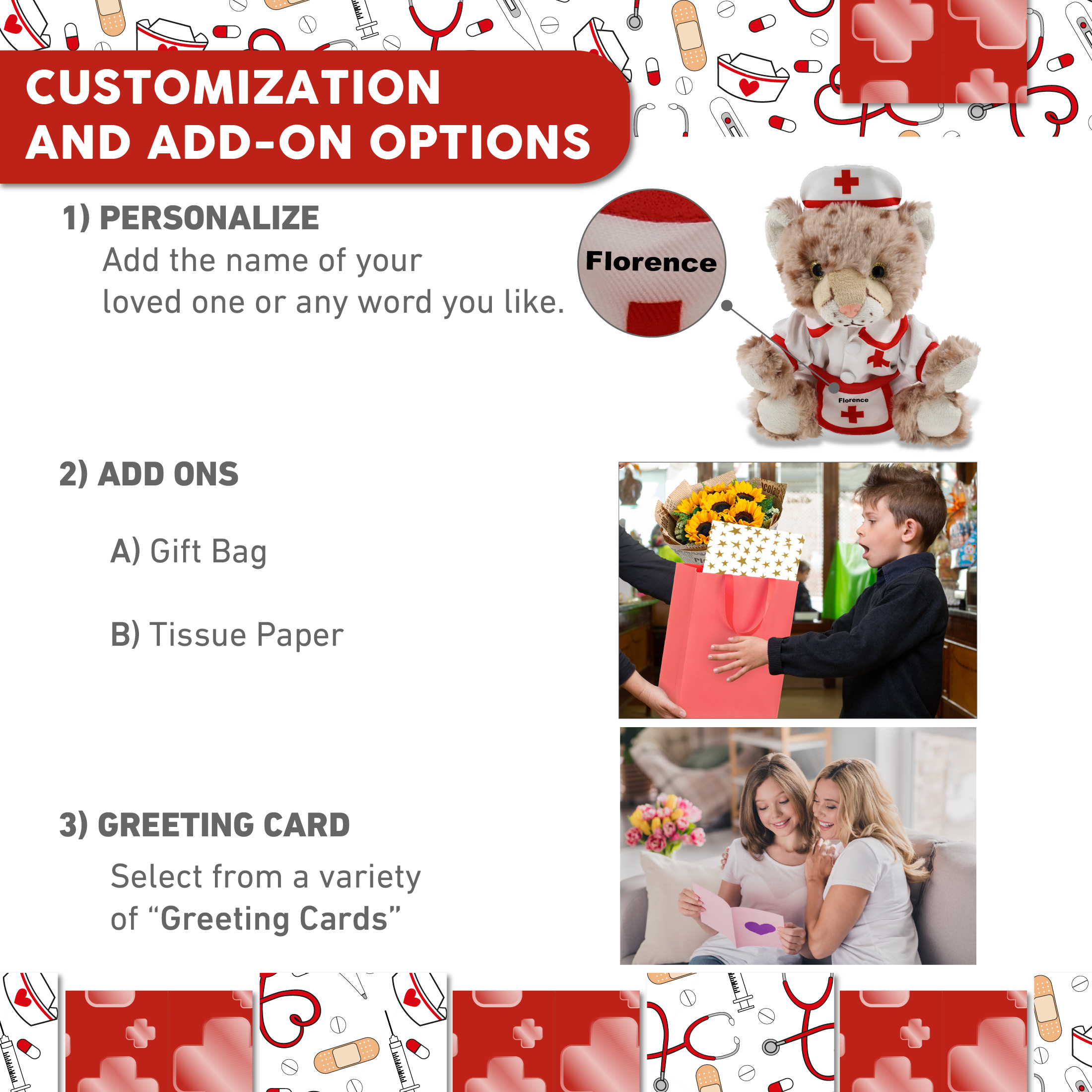 - Personalization, Customization, and Add-On Options – The stuffed Cheetah comes dressed in a cute nurse costume, complete with nurse cap, nurse dress and apron. Make your nurse teddy bear stuffed animal plush special by adding a personalized name, which we’ll imprint onto the plush. You can also customize your nurse cheetah plush by adding any of our add-ons to create the perfect gift: 1) Gift Bag 2) Tissue Paper 3) Greeting Card.