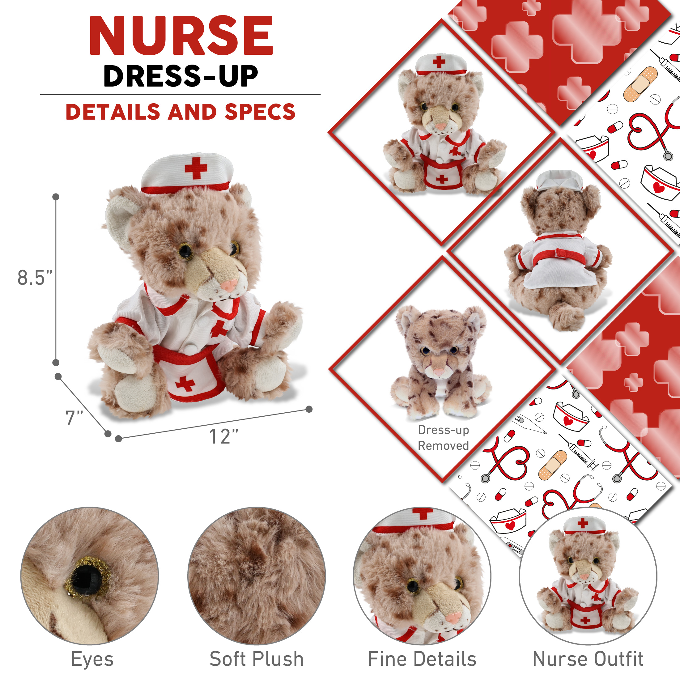 - Squat Cheetah with Nurse Stuffed Animal Clothes Features a Classic Nurse Outfit – Designed with red lining and a cross against the white nurse dress and the nurse cap and apron. The cheetah stuffed animal plush has soft plush, perfect for everyday snuggles. This stuffed animal with clothes makes the perfect addition to your collection of cheetah teddy bear with clothes or giveaway hospital toys to give to sick children.