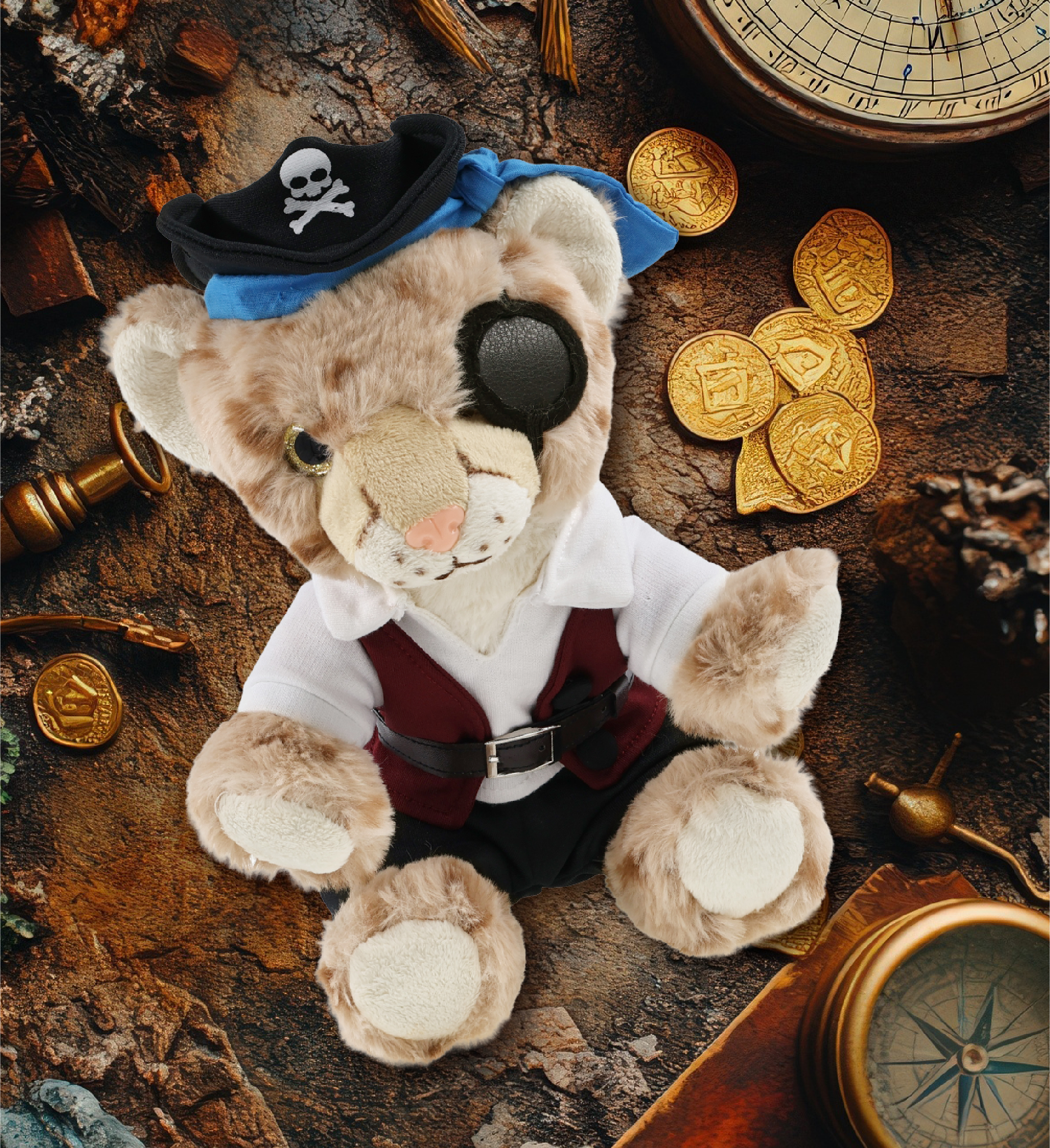 - The Pirate-Themed Squat Cheetah Stuffed Animal Features a Fun Mix of Pirate Vibes and Classic Bear – Making it both quirky and lovable. It comes with a complete head-to-toe pirate teddy bear outfits, featuring a hat with skull print and a blue bandana, a red vest, black pants, brown belt, white shirt, and an eye patch, making your cute squat cheetah a complete pirate, ready for some wild animal sea pirate adventure