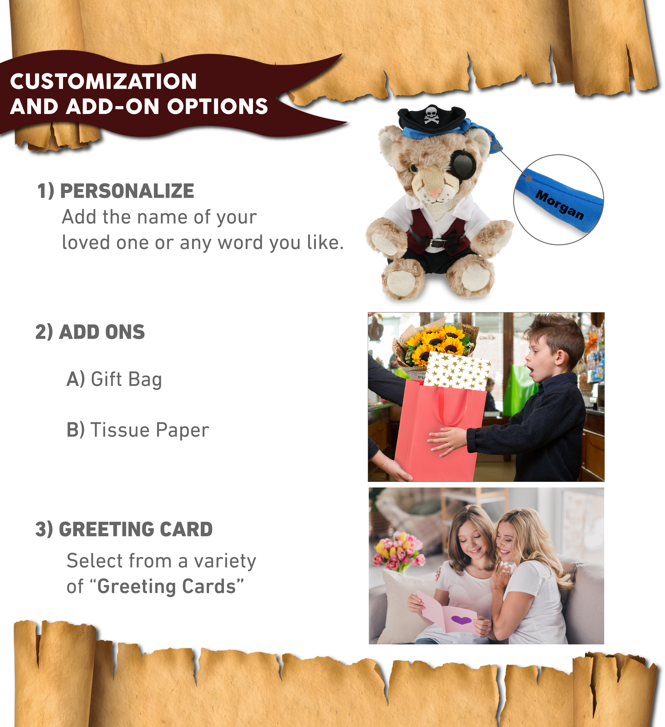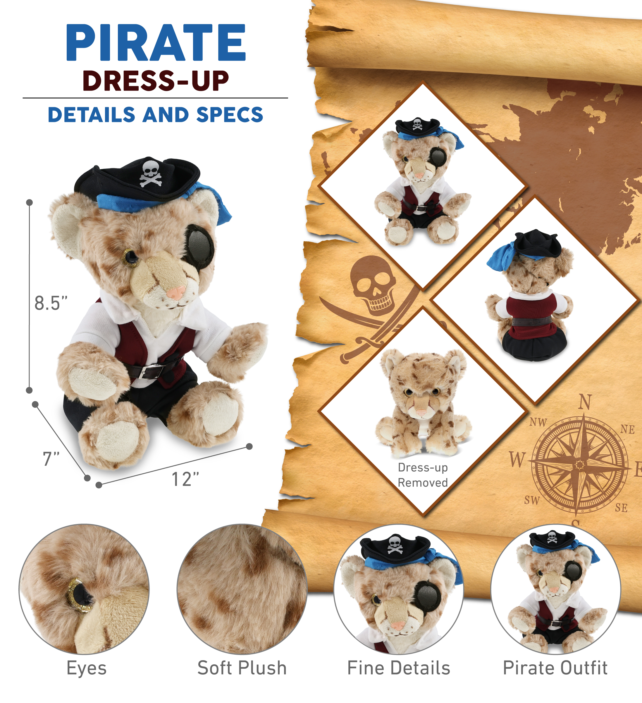 - Personalization, Customization, and Add-On Options – The cheetah figure stuffed toy comes dressed in full pirate clothes, complete with pirate hat, pirate vest, pirate shirt, pants, belt, and pirate mask. Make your bear doll special by adding a personalized name, which we will imprint onto the plush. You can also customize your stuffed animal by adding any of our add-ons to create the perfect gift: 1) Gift Bag 2) Tissue Paper 3) Greeting Card.