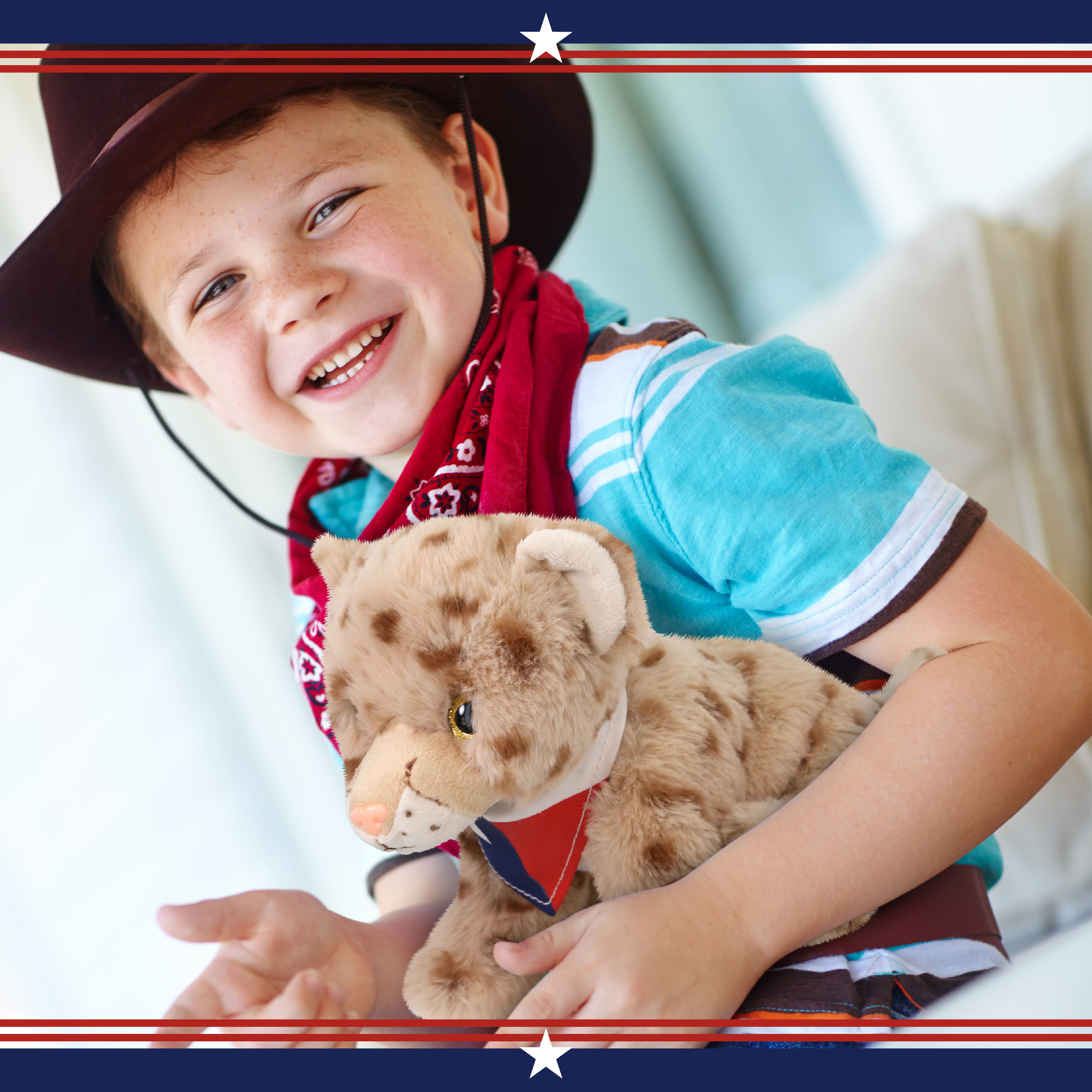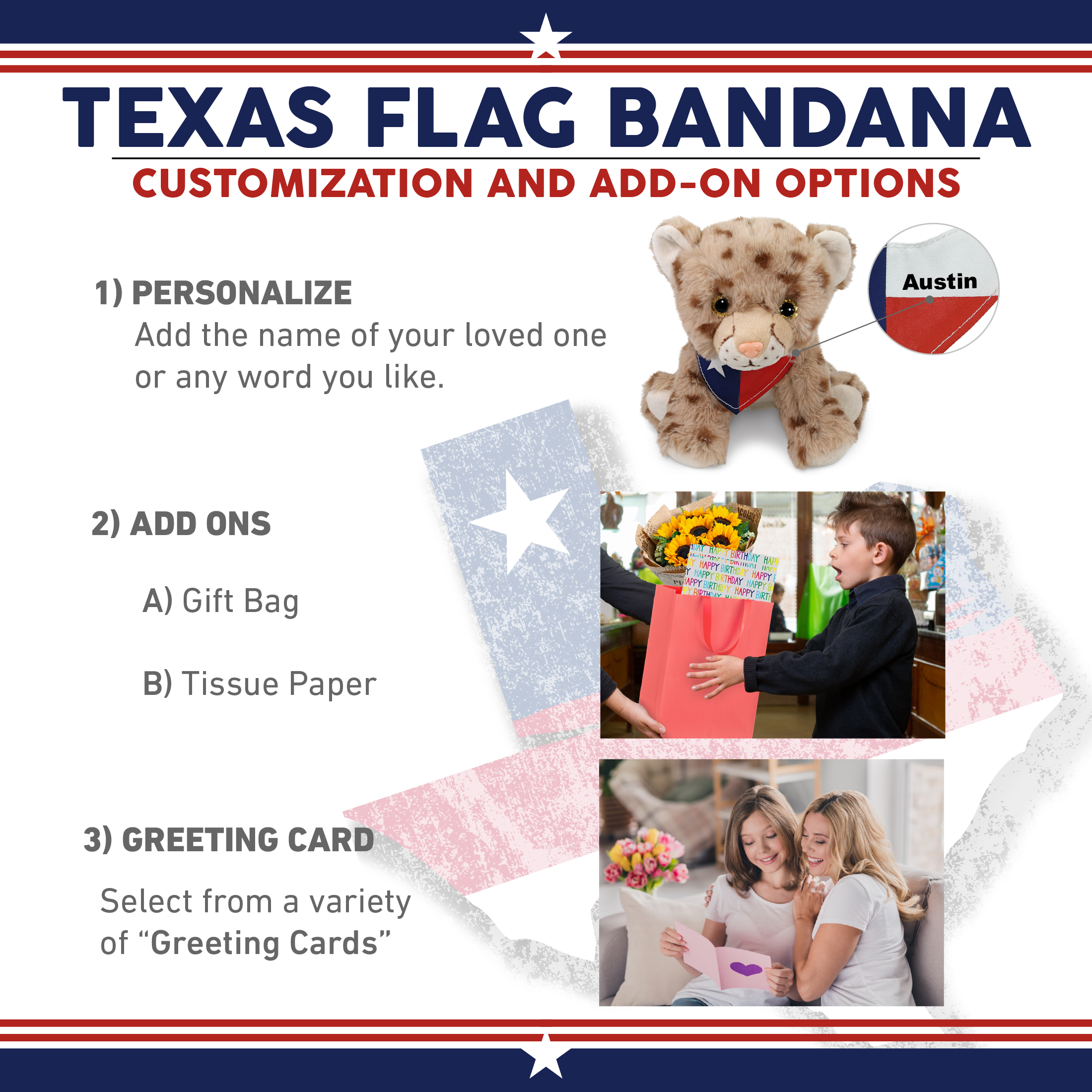 - Personalization, Customization, and Add-On Options – The Squat Cheetah stuffed animal plush comes dressed in a removable cowboy outfit accessory, a Texas flag bandana, giving this plush animal a rugged western look. Make it cool by personalizing it with a name, which we will imprint directly onto the plush. You can also customize your plush bear by adding any of our add-ons to create the perfect gift: 1) Gift Bag 2) Tissue Paper 3) Greeting Card.