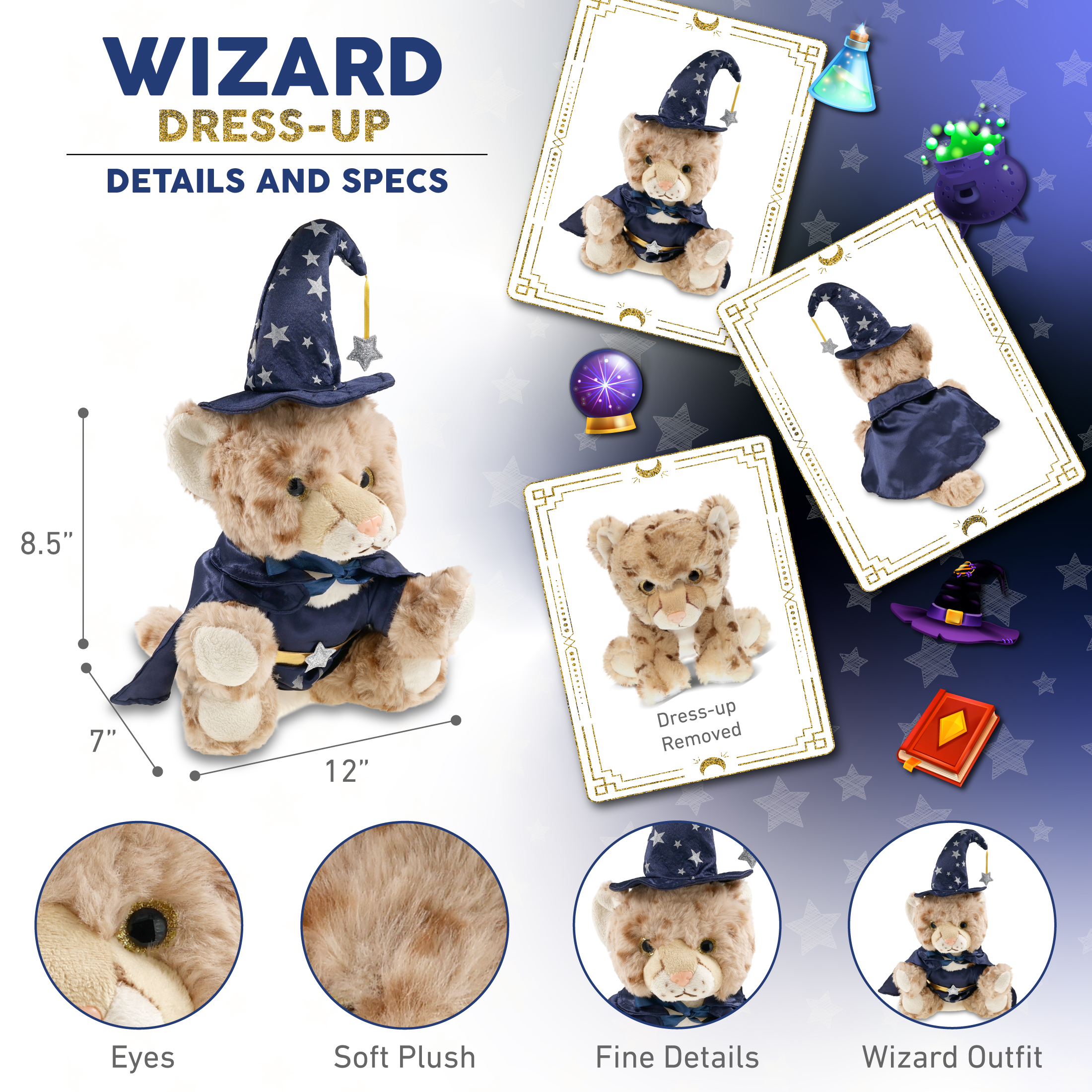 - The Wizard Stuffed Squat Cheetah Plush is Perfect for Fantasy Lovers – Everyone who loves stuffed animal toys will be thrilled to have a wizard stuffed cheetah, whether it’s a cute stuffed animal gift or a cute teddy bear plush for a wizard-themed collection. Perfect wizard fluffy stuffed animal for pretend play and as a toy gift for kids who love stuffed teddy bear toys and stuffed animals for boys and girls. Recommended for ages 3 and up.