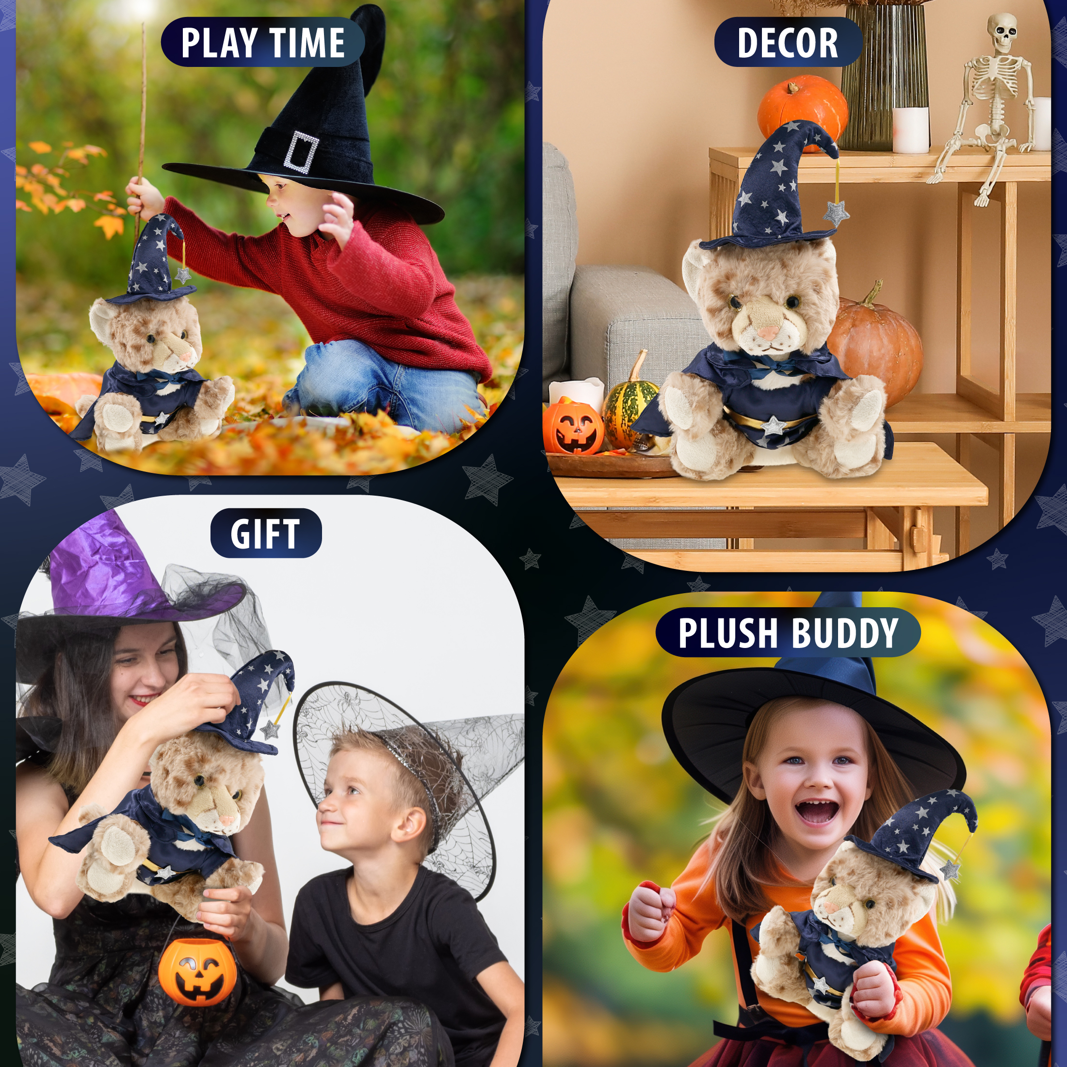 - Features a Cute Teddy Bear Plush with Wizard Teddy Bear Costume – With a wizard cloak and wizard stuffed animal hat adorned with silver stars, this cheetah Halloween stuffed animal has a playful and stylish magical look! The detailed wizard costume adds character to your cheetah stuffed animal toys and makes them stand out among other cute plush toys. Everyone will love to play with a huggable stuffed animal with a wizard dress up set.