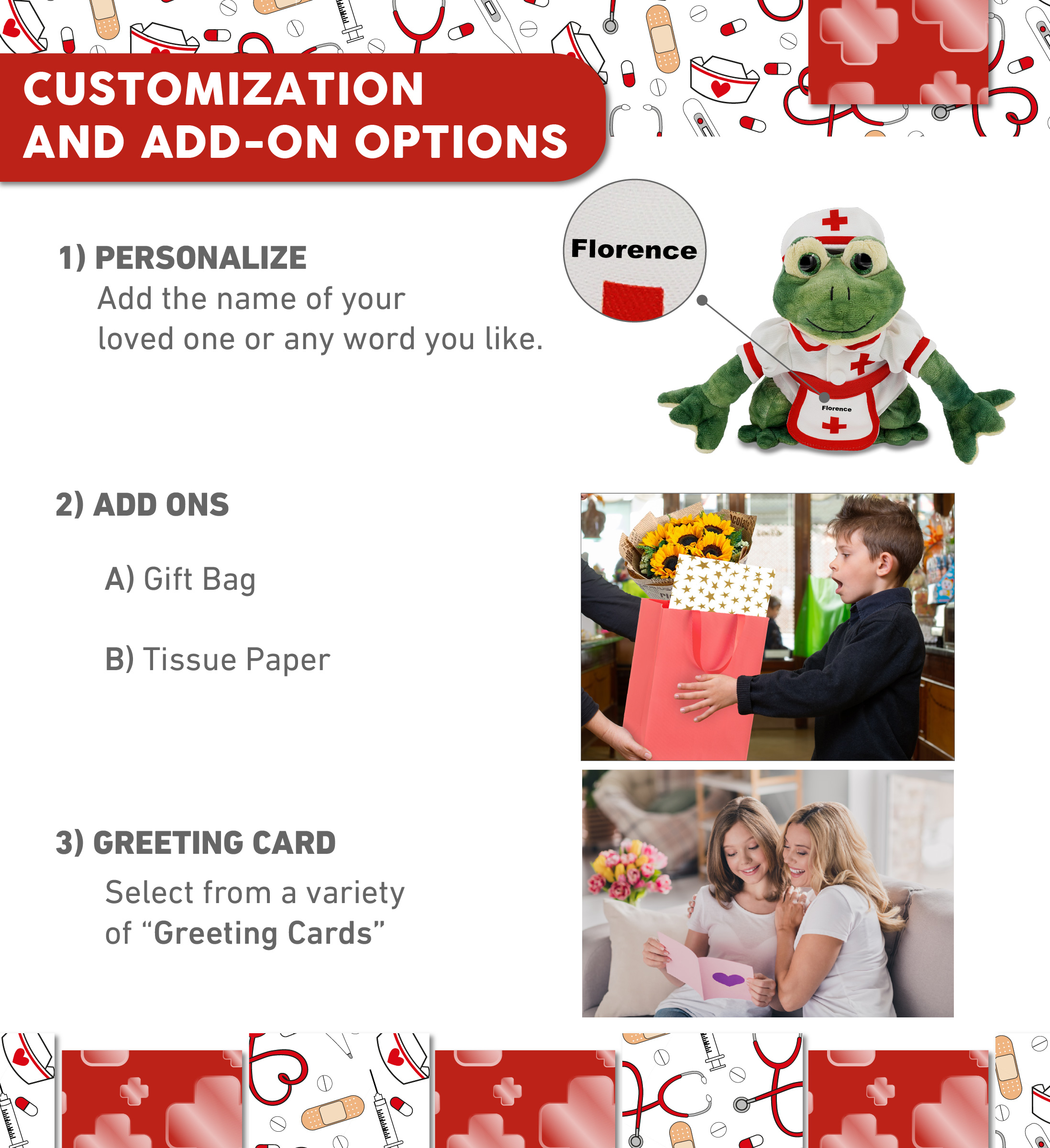 - Personalization, Customization, and Add-On Options – The stuffed frog comes dressed in a cute nurse costume, complete with nurse cap, nurse dress, and apron. Make your nurse teddy bear stuffed animal plush special by adding a personalized name, which we’ll imprint onto the plush. You can also customize your nurse frog plush by adding any of our add-ons to create the perfect gift: 1) Gift Bag 2) Tissue Paper 3) Greeting Card.