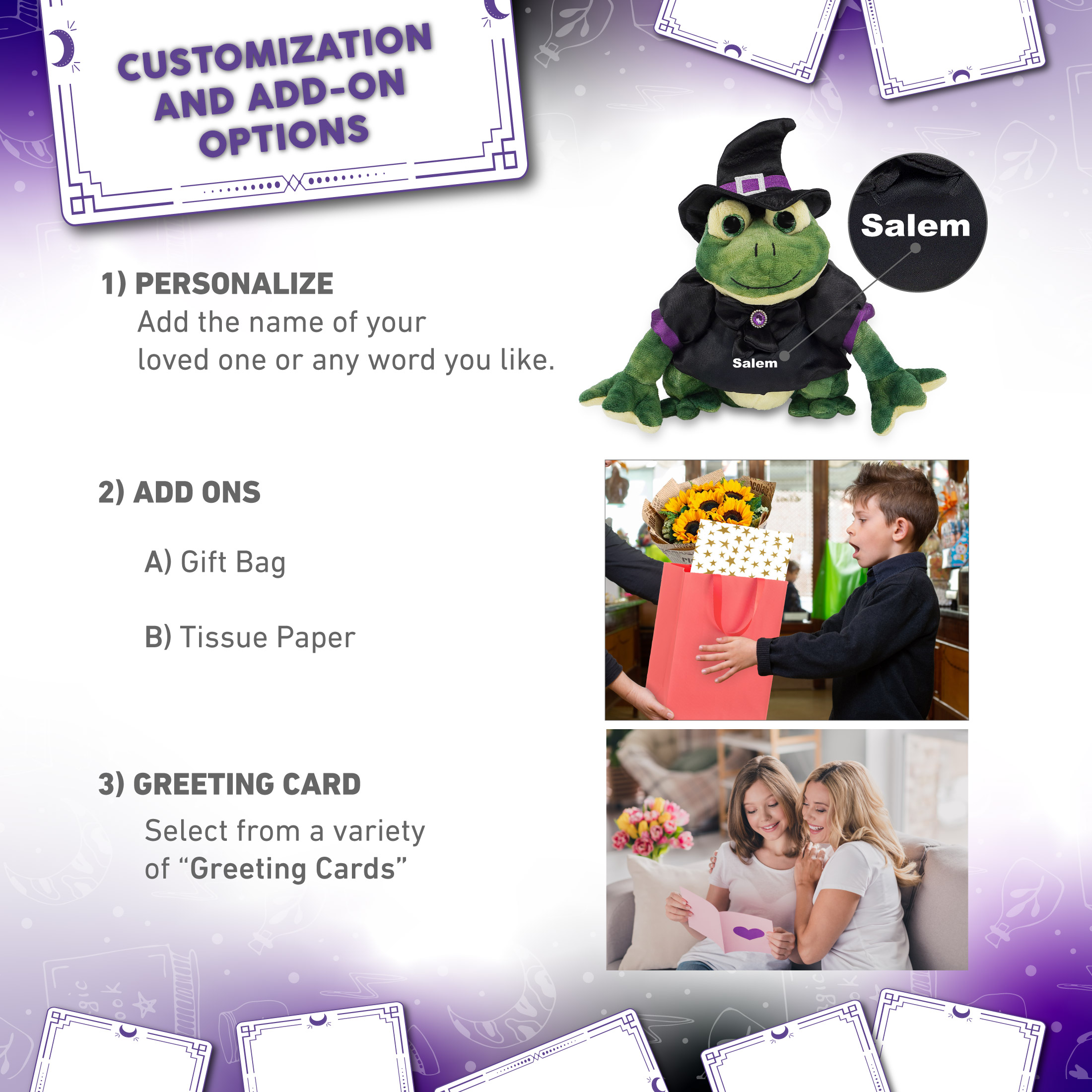 - Personalization, Customization, and Add-On Options – The frog Halloween plush toy comes dressed in a witch outfit, complete with black and purple cloak and pointy black witch hat. Make your teddy bear doll special by adding a personalized name, which we will imprint onto the plush. You can also customize your witch frog stuffed animal by adding any of our add-ons to create the perfect gift: 1) Gift Bag 2) Tissue Paper 3) Greeting Card.