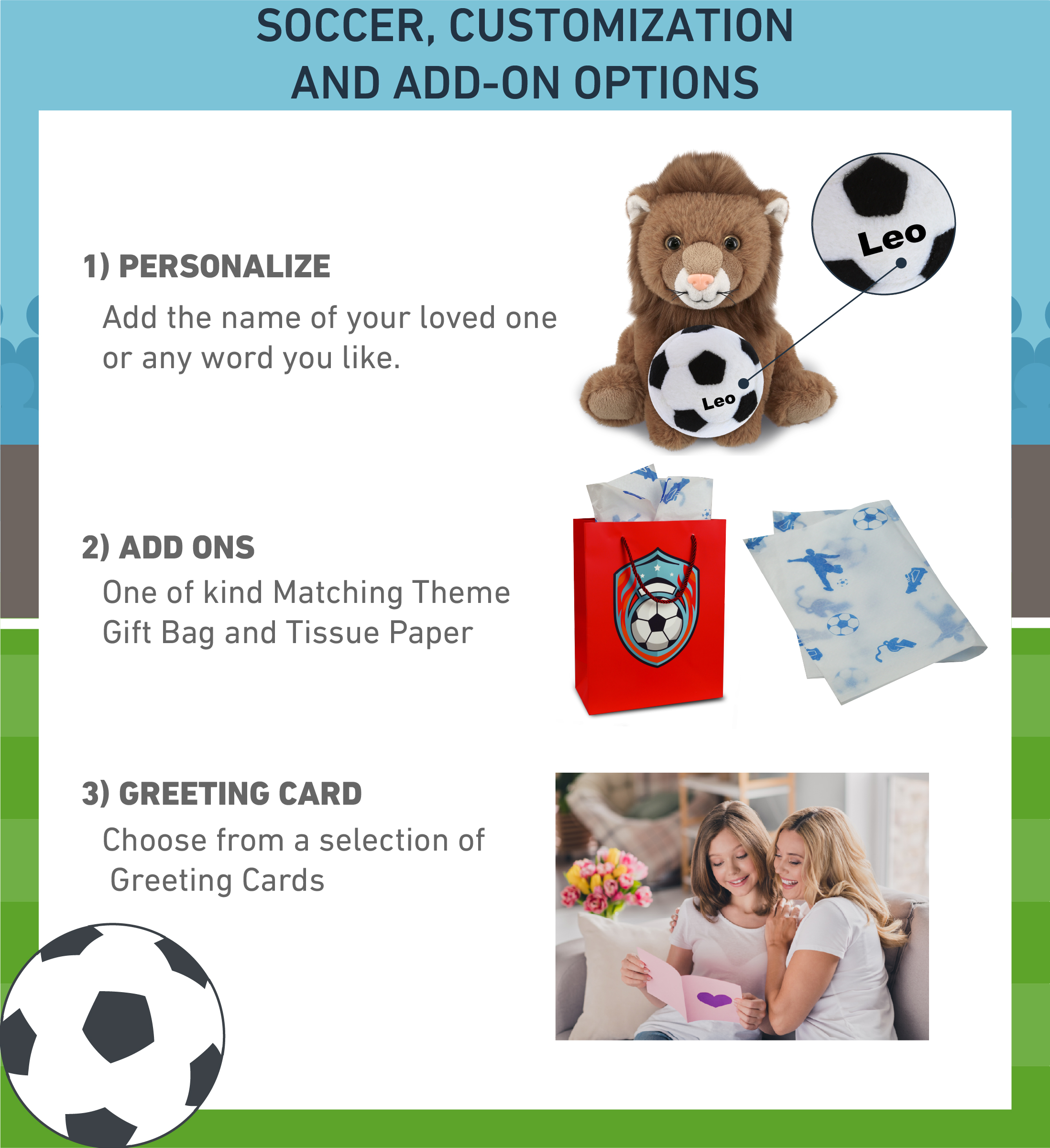 - PERSONALIZATION, CUSTOMIZATION, AND ADD-ON OPTIONS – Super Soft Sports Stuffed Animal Squat Lion comes customized with a Soccer Ball Plush. You can personalize it with the name of your loved one imprinted on the item. You also have the option to add some or all of the cool add-ons to make your gift extra special: 1) Gift Bag; 2) Tissue Paper; 3) Greeting Card.
