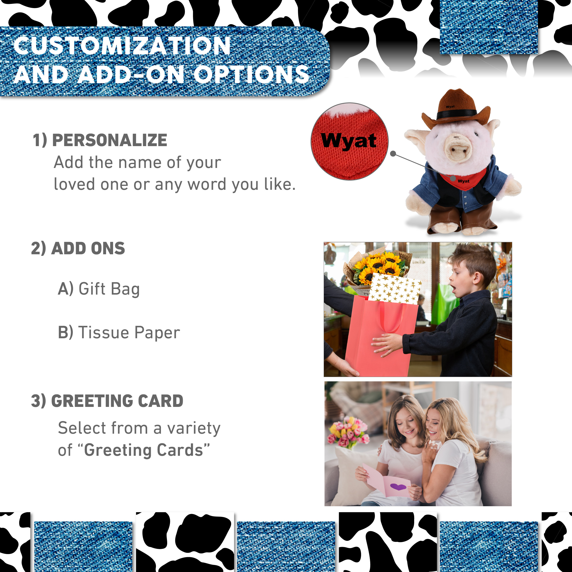 - Personalization, Customization and Add-On Options – The piggy stuffed animal plush comes dressed in a cowboy outfit, complete with cowboy vest shirt, pants, bandana, and cowboy hat. Make it cool by personalizing it with the name, which we will imprint directly onto the stuffy plush. You can also customize your cowboy plush piggy by adding any of our add-ons to create the perfect gift: 1) Gift Bag 2) Tissue Paper 3) Greeting Card.