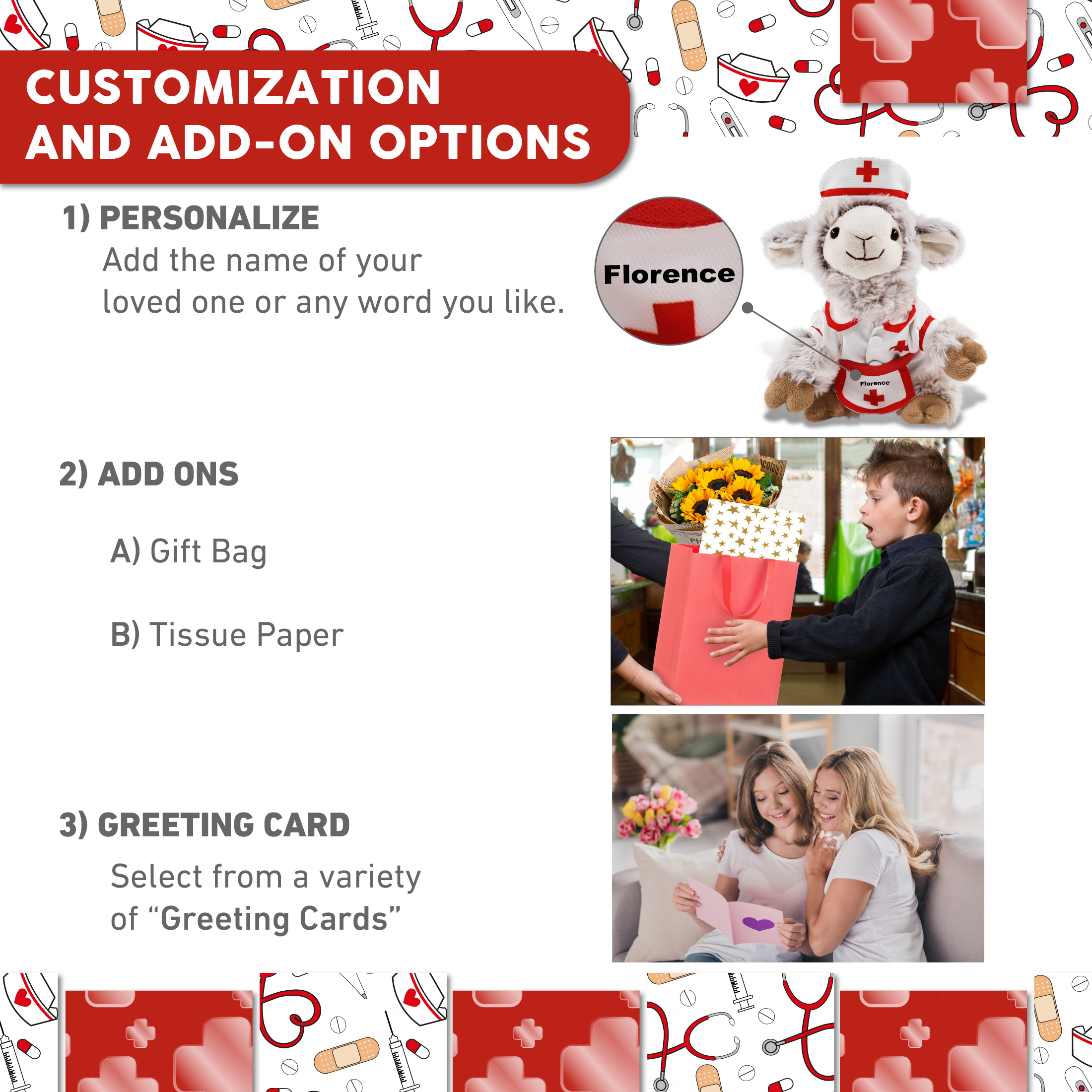- Personalization, Customization, and Add-On Options – The stuffed sheep comes dressed in a cute nurse costume, complete with nurse cap, nurse dress and apron. Make your nurse teddy bear stuffed animal plush special by adding a personalized name, which we’ll imprint onto the plush. You can also customize your nurse sheep plush by adding any of our add-ons to create the perfect gift: 1) Gift Bag 2) Tissue Paper 3) Greeting Card.