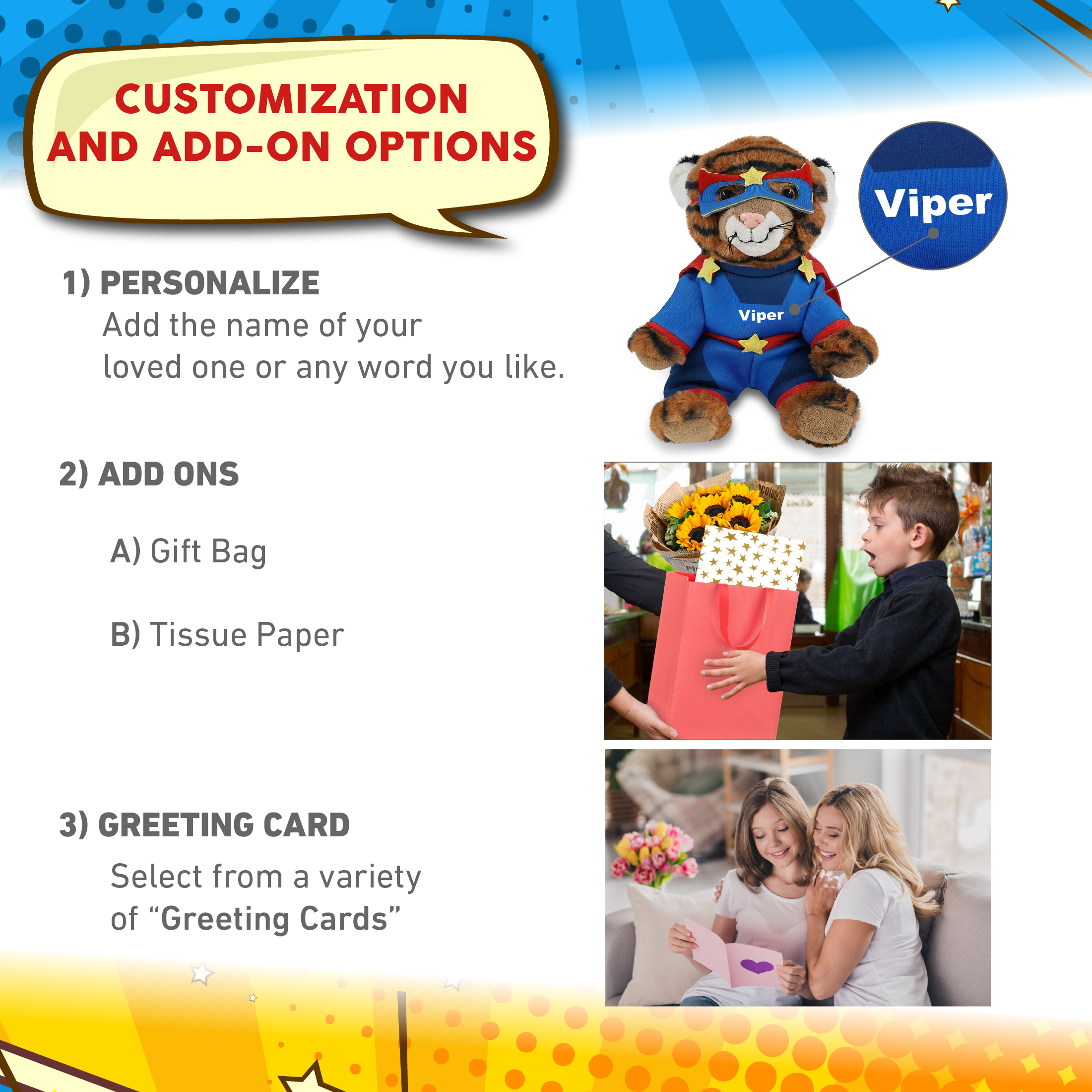 - Personalization, Customization, and Add-On Options – The squat tiger stuffed animal comes dressed in a full superhero outfit, complete with eye mask, suit with cape, and star details. Make your super hero tiger toy special by adding a personalized name, which we will imprint onto the plush. You can also customize your plush hero toy by adding any of our add-ons to create the perfect gift: 1) Gift Bag 2) Tissue Paper 3) Greeting Card.