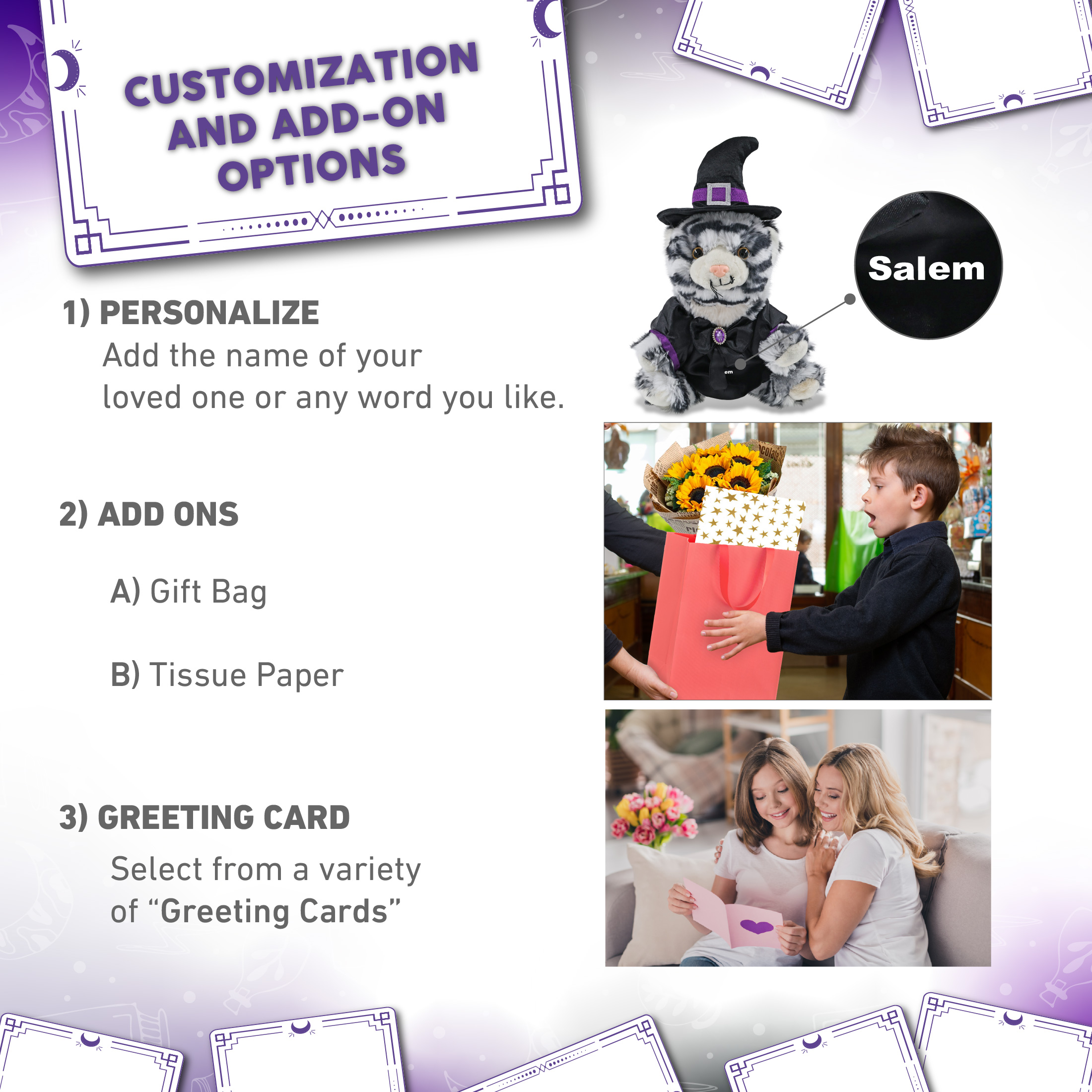 - Personalization, Customization, and Add-On Options – The tiger Halloween plush toy comes dressed in a witch outfit, complete with black and purple cloak and pointy black witch hat. Make your teddy bear doll special by adding a personalized name, which we will imprint onto the plush. You can also customize your witch tiger stuffed animal by adding any of our add-ons to create the perfect gift: 1) Gift Bag 2) Tissue Paper 3) Greeting Card.