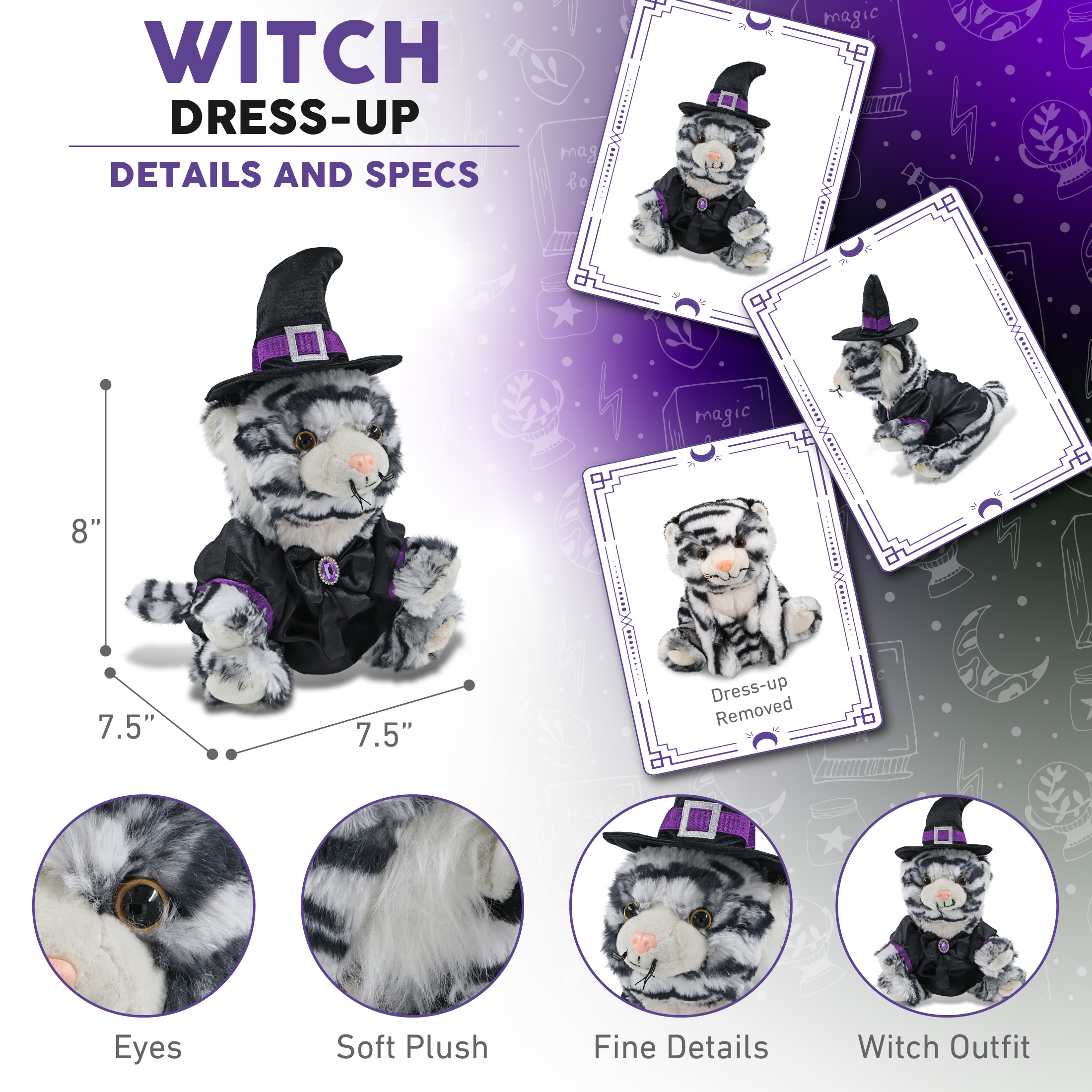 - Includes 1 DolliBu Squat White Tiger Toy Dressed in Witch Costume – The squat white tiger arrives with a witch stuffed animal costume. The stuffed tiger toy features a black witch dress up set with intricate purple details and black bow with a gem. The perfect tiger plush to add spooky vibes to a display, along with other Halloween stuffed animals. A cute stuffed animal that measures 7.5LX7.5WX8H inches, perfect for ages 3 and up.