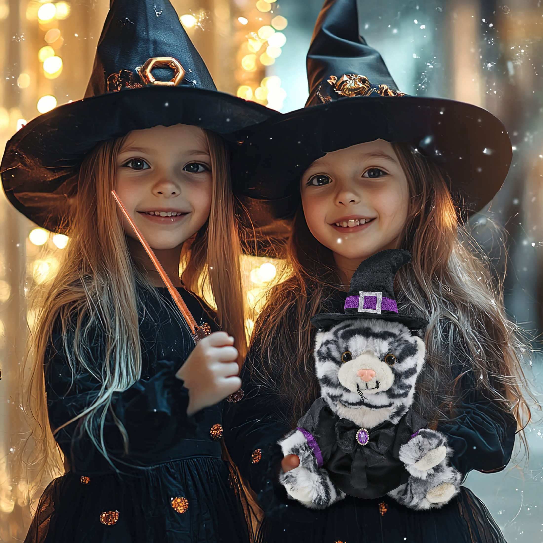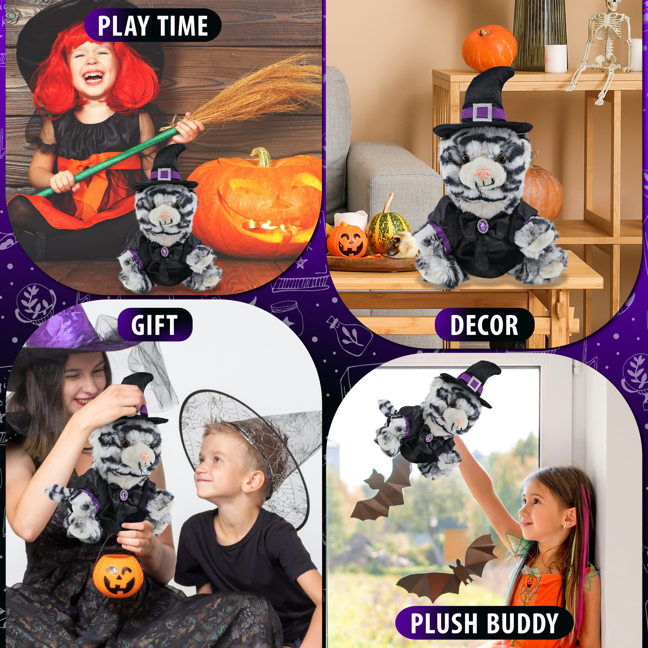- Features a Teddy Bear Halloween Plush Wearing Witch Plush Doll Clothes – This cute witch tiger stuffed toy comes dressed in a soft black satin witch doll dress with purple trim and a shiny gem-accented bow. It also wears a pointy black witch hat decor with a silver buckle and purple band, completing the spooky Halloween teddy bear look. The tiger plush toy witch costume is removable and fits snugly on the tiger Halloween witch doll.