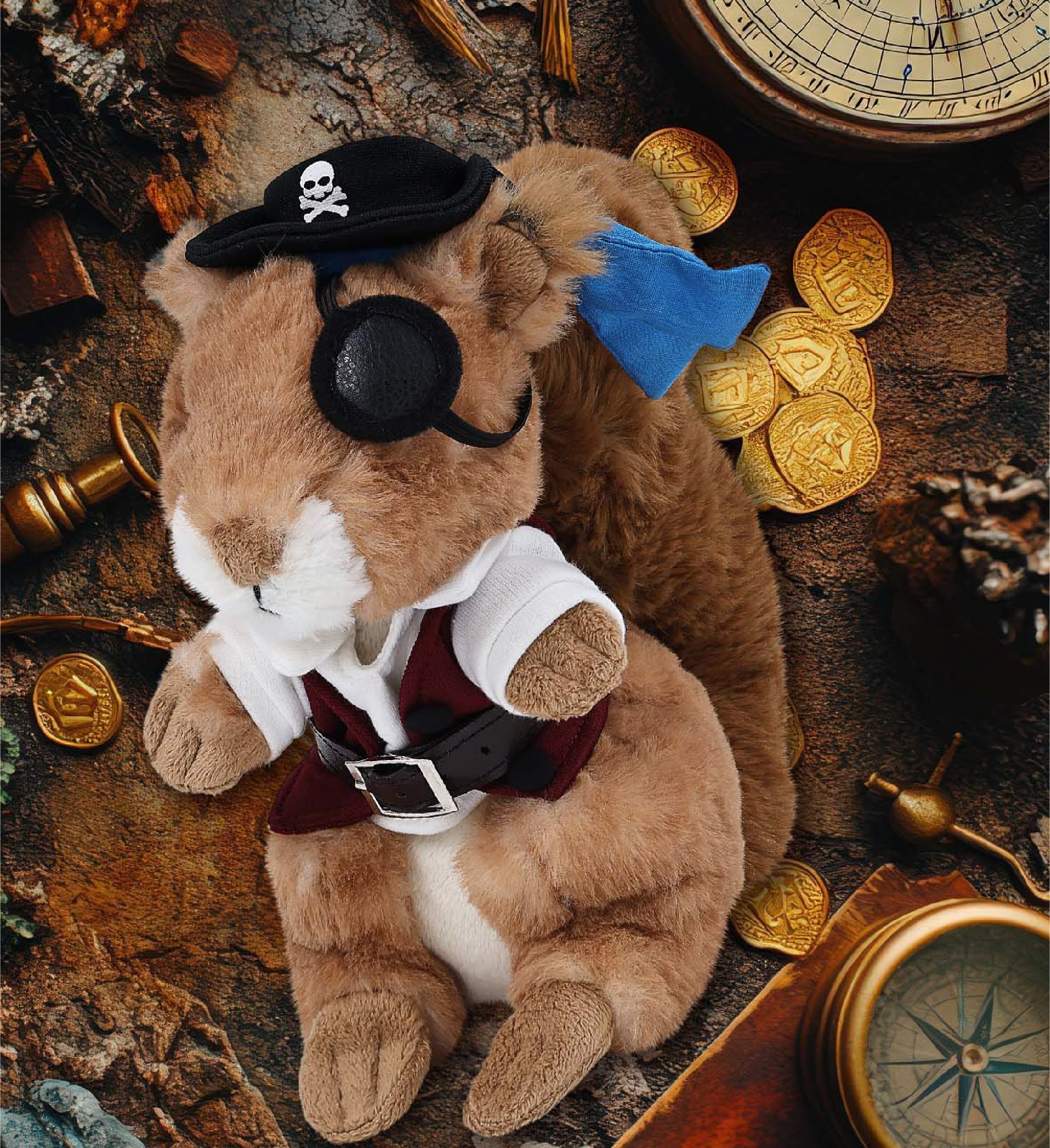 - Features of The Pirate-Themed Squirrel Stuffed Animal Doll – The squirrel pirate plush features a playful mix of pirate vibes and classic teddy bear style, making it both quirky and lovable. It comes with a complete head-to-toe pirate outfit set, featuring a pirate hat with skull print and a blue bandana, a red vest, black pants, brown belt, white pirate shirt, and an eye patch, making your squirrel doll ready for some pirate adventure.