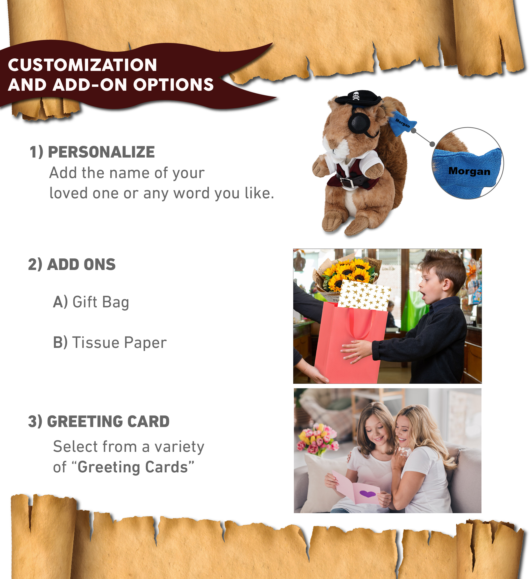 - Personalization, Customization, and Add-On Options – The squirrel plush stuffed toy comes dressed in full pirate clothes, complete with pirate hat, pirate vest, shirt, pants, belt, and pirate mask. Make your plush squirrel special by adding a personalized name, which we will imprint onto the plush. You can also customize your stuffed animal doll by adding any of our add-ons to create the perfect gift: 1) Gift Bag 2) Tissue Paper 3) Greeting Card.