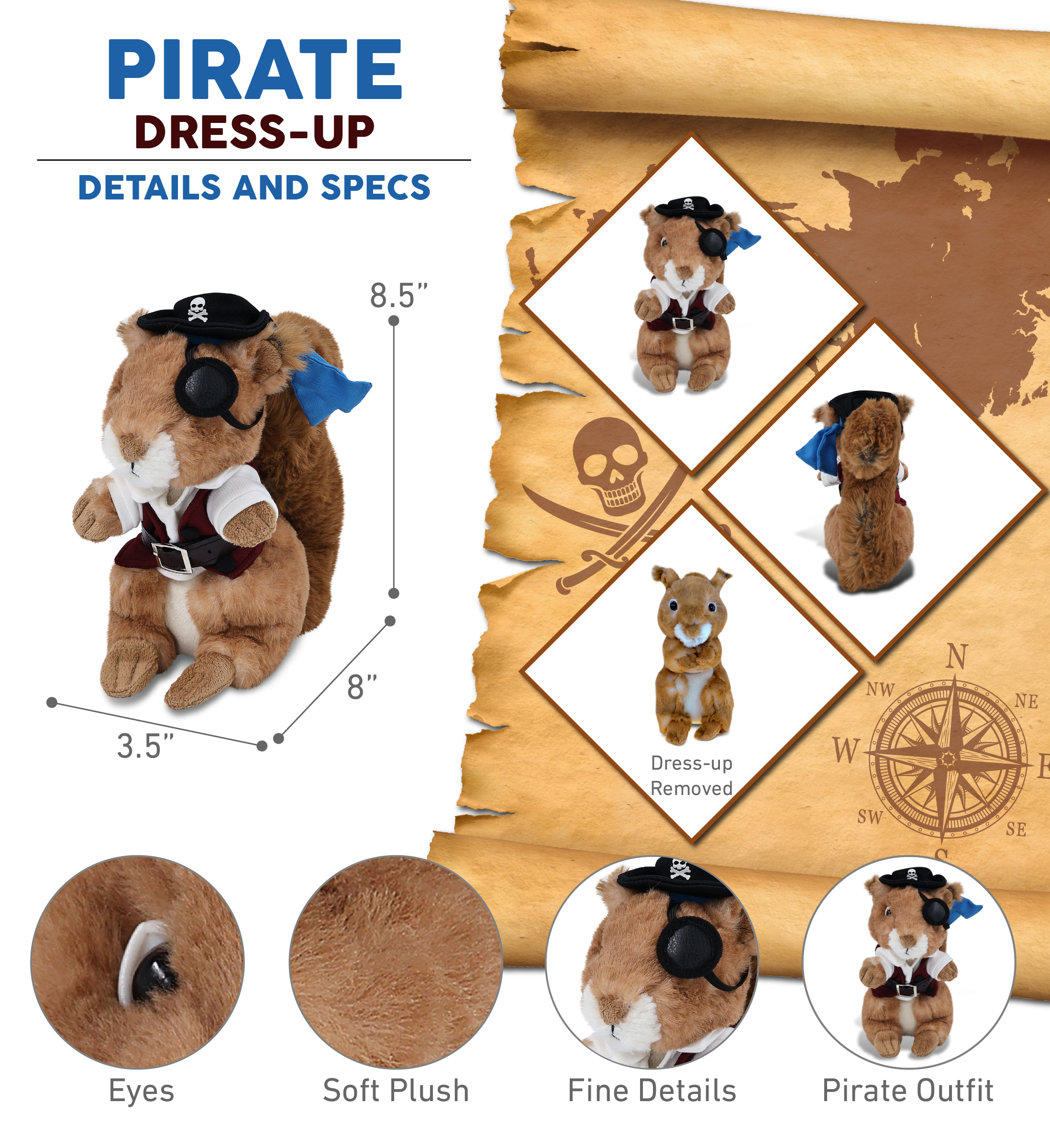- Includes 1 DolliBu Plush Squirrel Toy with Pirate Outfit – The stuffed animal squirrel doll wears a pirate costume featuring a pirate vest, belt, shirt, pants, and pirate hat. Whether you’re collecting squirrel toys or hunting for pirate stuff for kids, this toy squirrel is the perfect combo of silly plush fun and dress-up adventure. This cute stuffed animal pirate plush measures approximately 8Lx3.5Wx8.5H inches. Best for kids ages 3 and up.