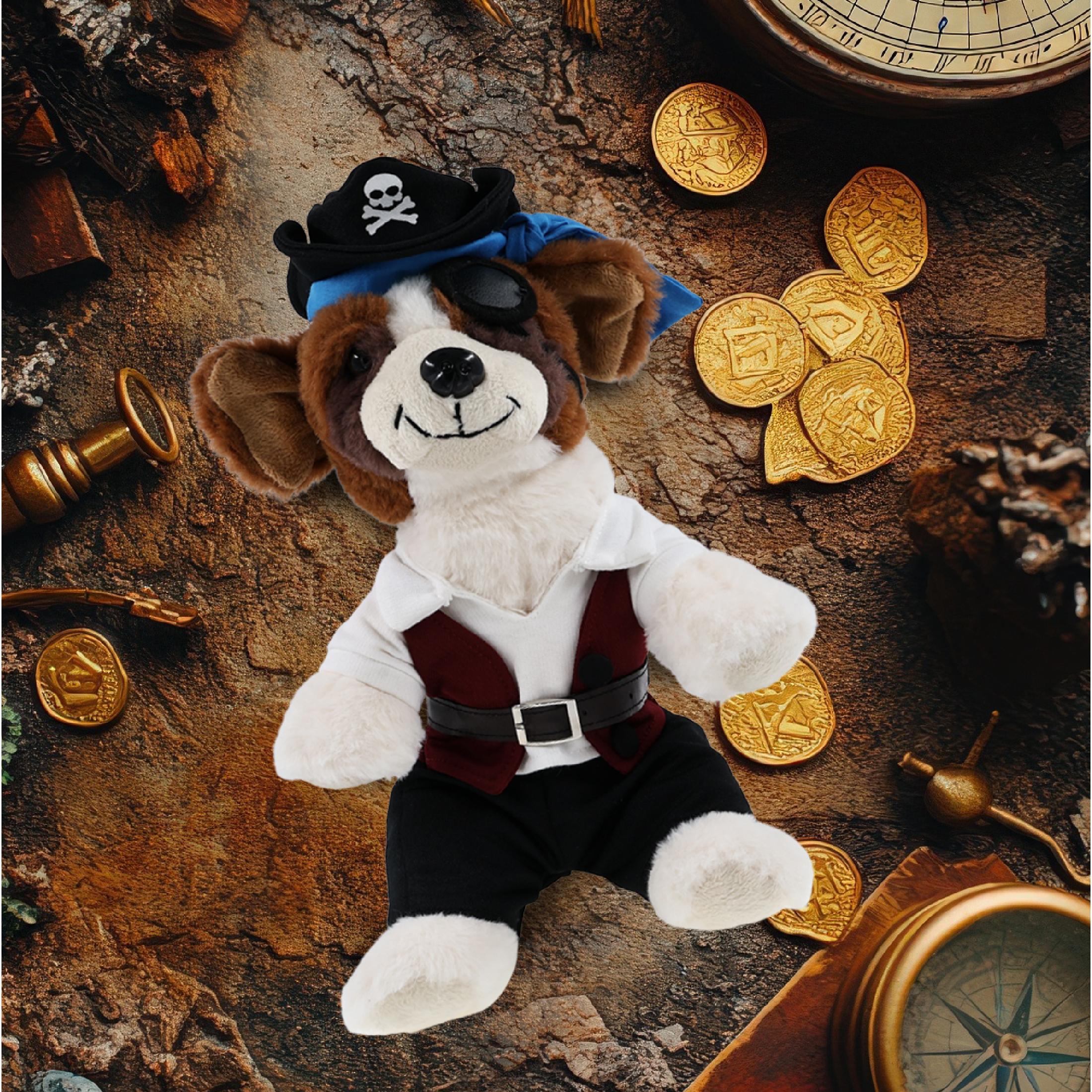 - The Pirate-Themed St. Bernard Dog Stuffed Animal Features a Fun Mix of Pirate Vibes and Classic Bear – Making it both quirky and lovable. It comes with a complete head-to-toe pirate teddy bear outfits, featuring a hat with skull print and a blue bandana, a red vest, black pants, brown belt, white shirt, and an eye patch, making your cute St. Bernard dog a complete pirate, ready for some wild animal sea pirate adventure