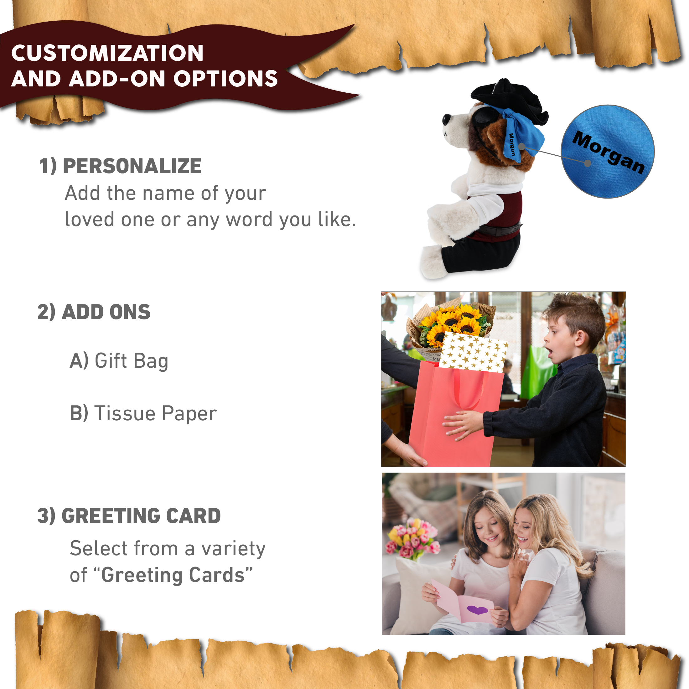 - Personalization, Customization, and Add-On Options – The St. Bernard dog figure stuffed toy comes dressed in full pirate clothes, complete with pirate hat, pirate vest, pirate shirt, pants, belt, and pirate mask. Make your doll special by adding a personalized name, which we will imprint onto the plush. You can also customize your stuffed animal by adding any of our add-ons to create the perfect gift: 1) Gift Bag 2) Tissue Paper 3) Greeting Card.