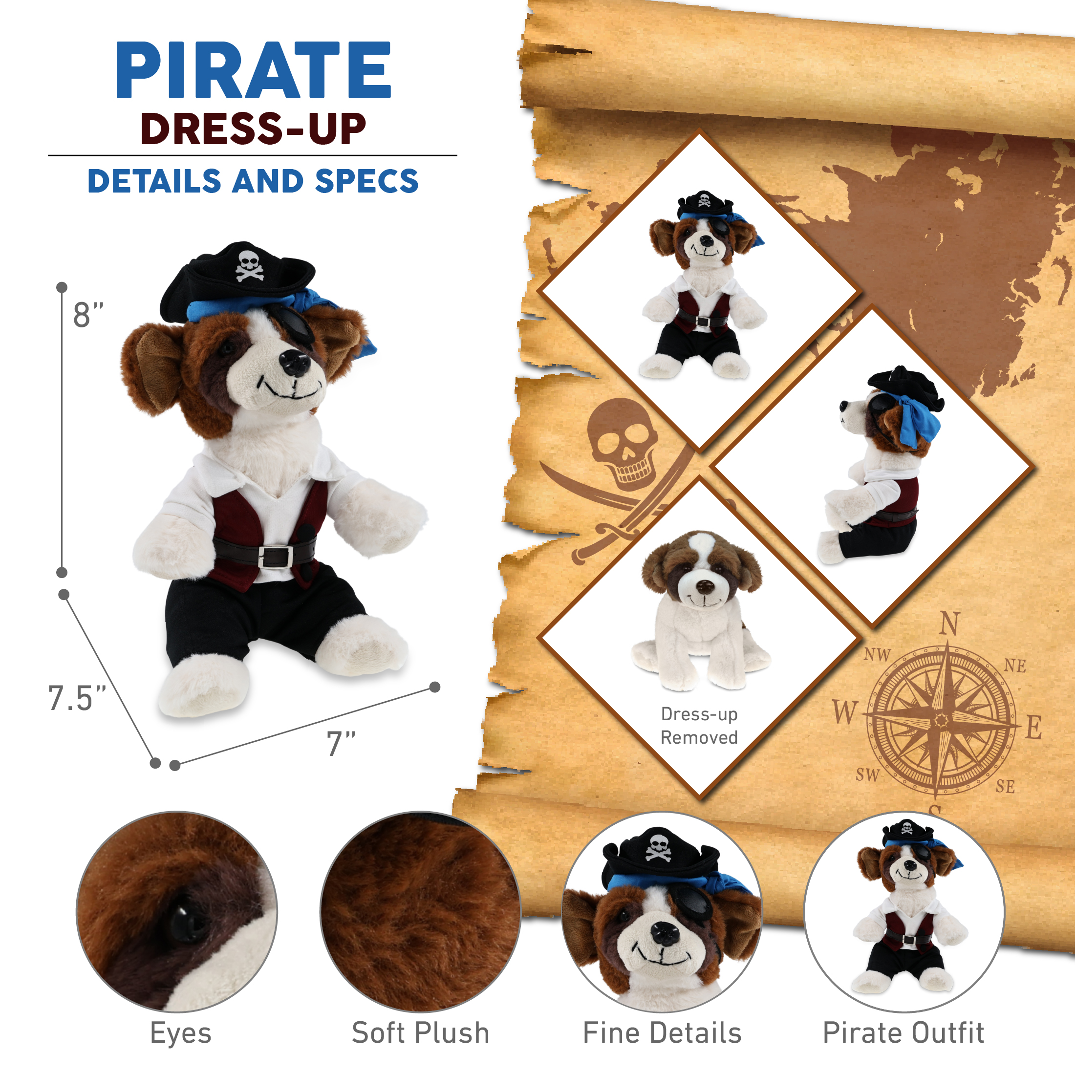 - Includes 1 DolliBu St. Bernard Dog Stuffed Toy with Pirate Outfit – The St. Bernard Dog toy wears a pirate teddy bear costume featuring a pirate vest, belt, shirt, pants, and pirate hat. Whether you’re collecting toys or hunting for pirate stuff for kids, this cute plush is the perfect combo of silly plush fun and dress-up adventure. This cute pirate stuffed animal Dog measures approximately 7.5Lx7Wx8H inches and is for kids ages 3 and up.