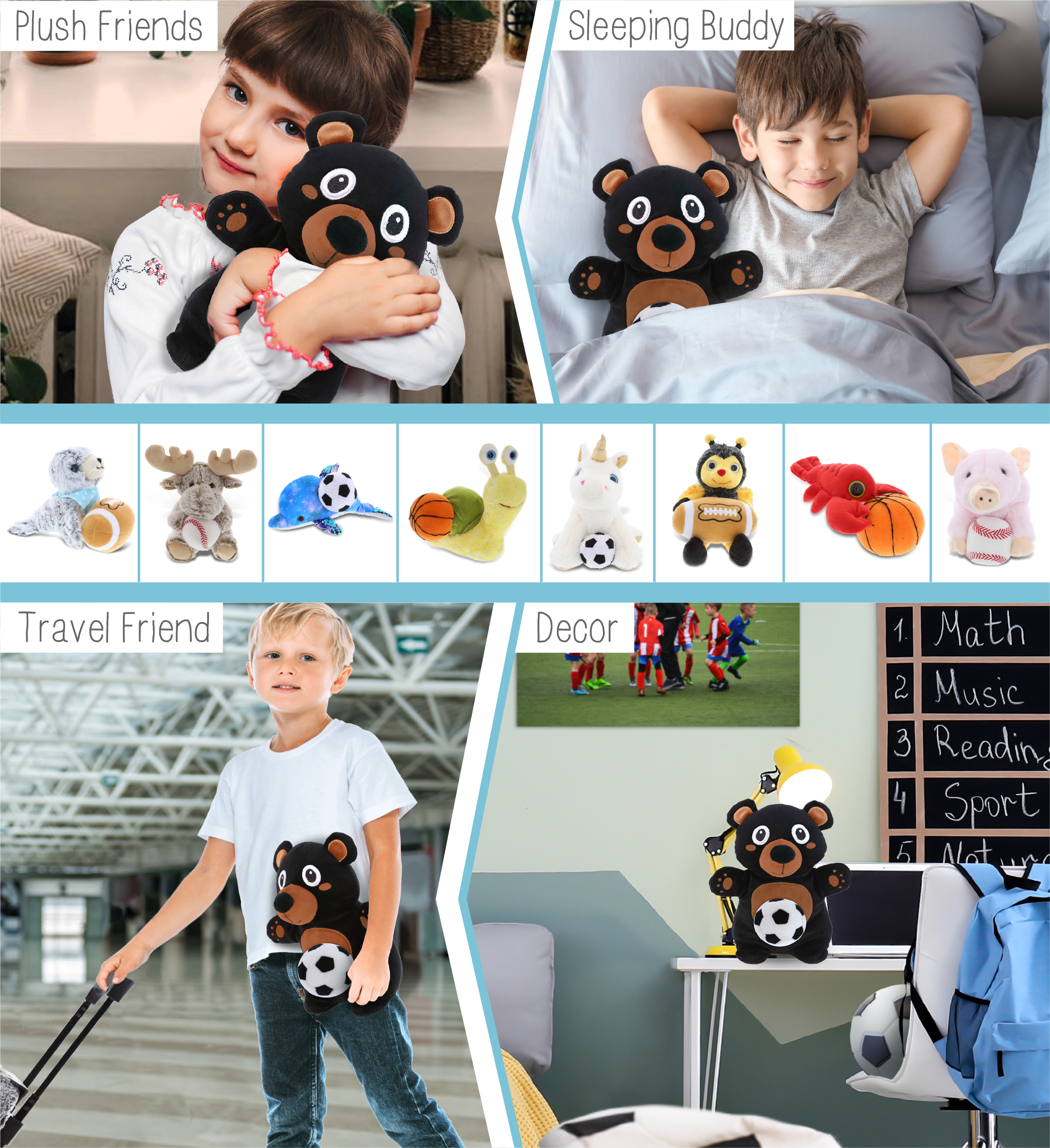 - Included with the Purchase of the Cute Black Bear Plush – Includes 1 DolliBu Snug-Mooshies Standing Black Bear Plush with a soccer ball plush, decorated with realistic features of cute bear. The black bear’s body with a sports gift ball plush makes the plush perfect for cuddles. The black bear plush toy features details like its cute ears. The black bear’s eyes make the critter so charming. The cute plush toy buddy measures 8Lx5Wx10H inches.