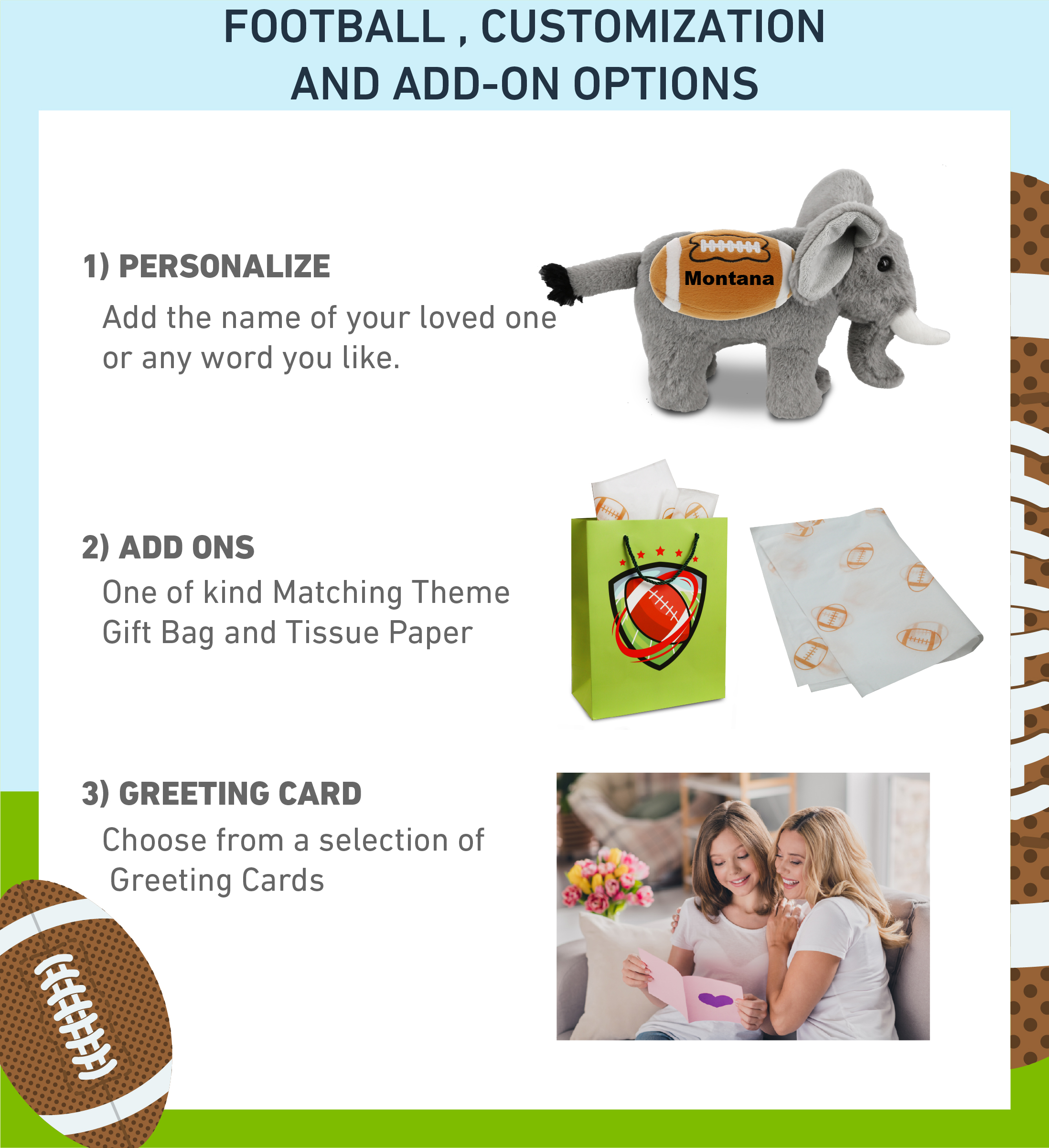 - PERSONALIZATION, CUSTOMIZATION, AND ADD-ON OPTIONS – Super Soft Sports Stuffed Animal Standing Elephant comes customized with a Football Plush. You can personalize it with the name of your loved one imprinted on the item. You also have the option to add some or all of the cool add-ons to make your gift extra special: 1) Gift Bag; 2) Tissue Paper; 3) Greeting Card.
