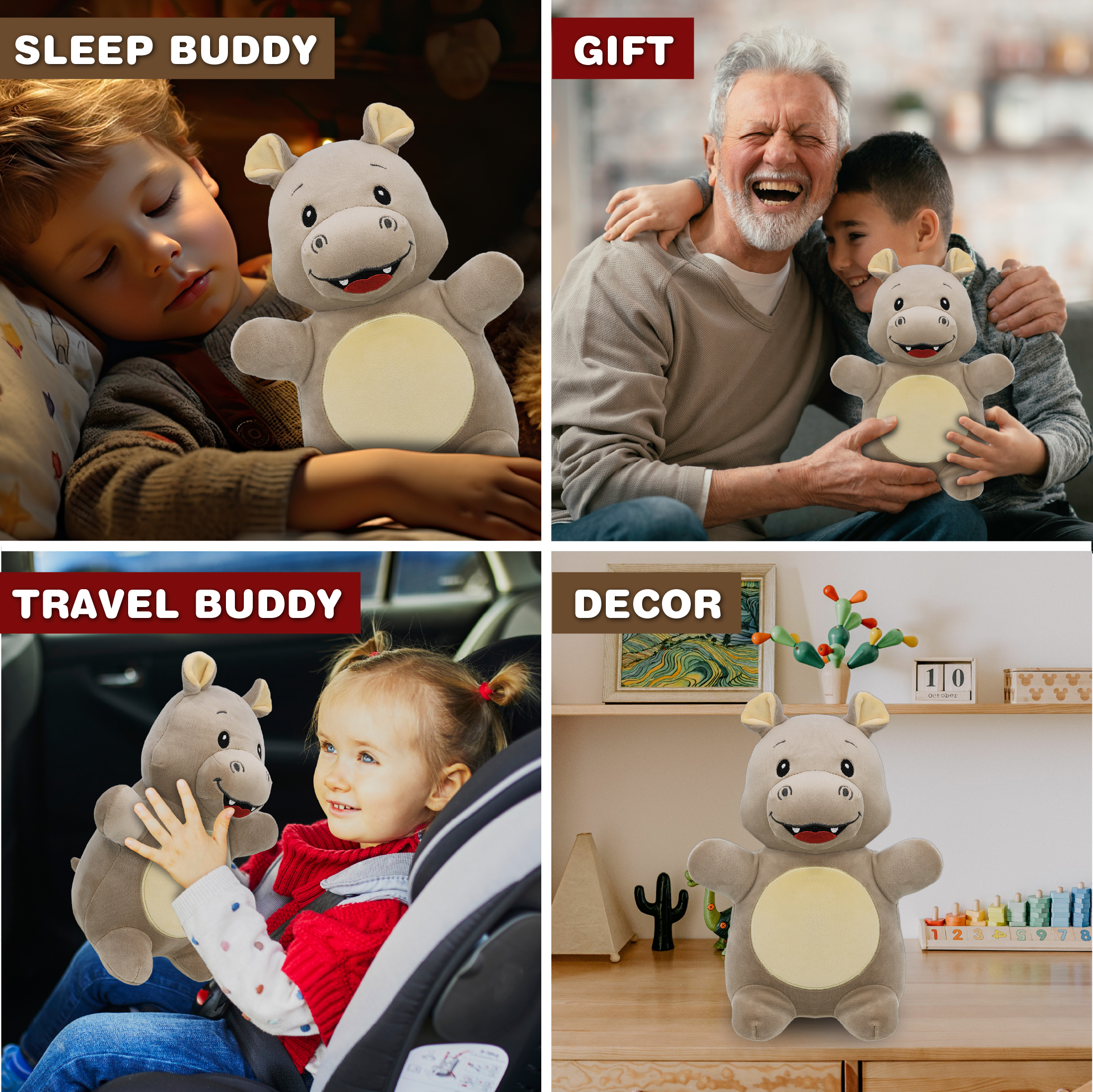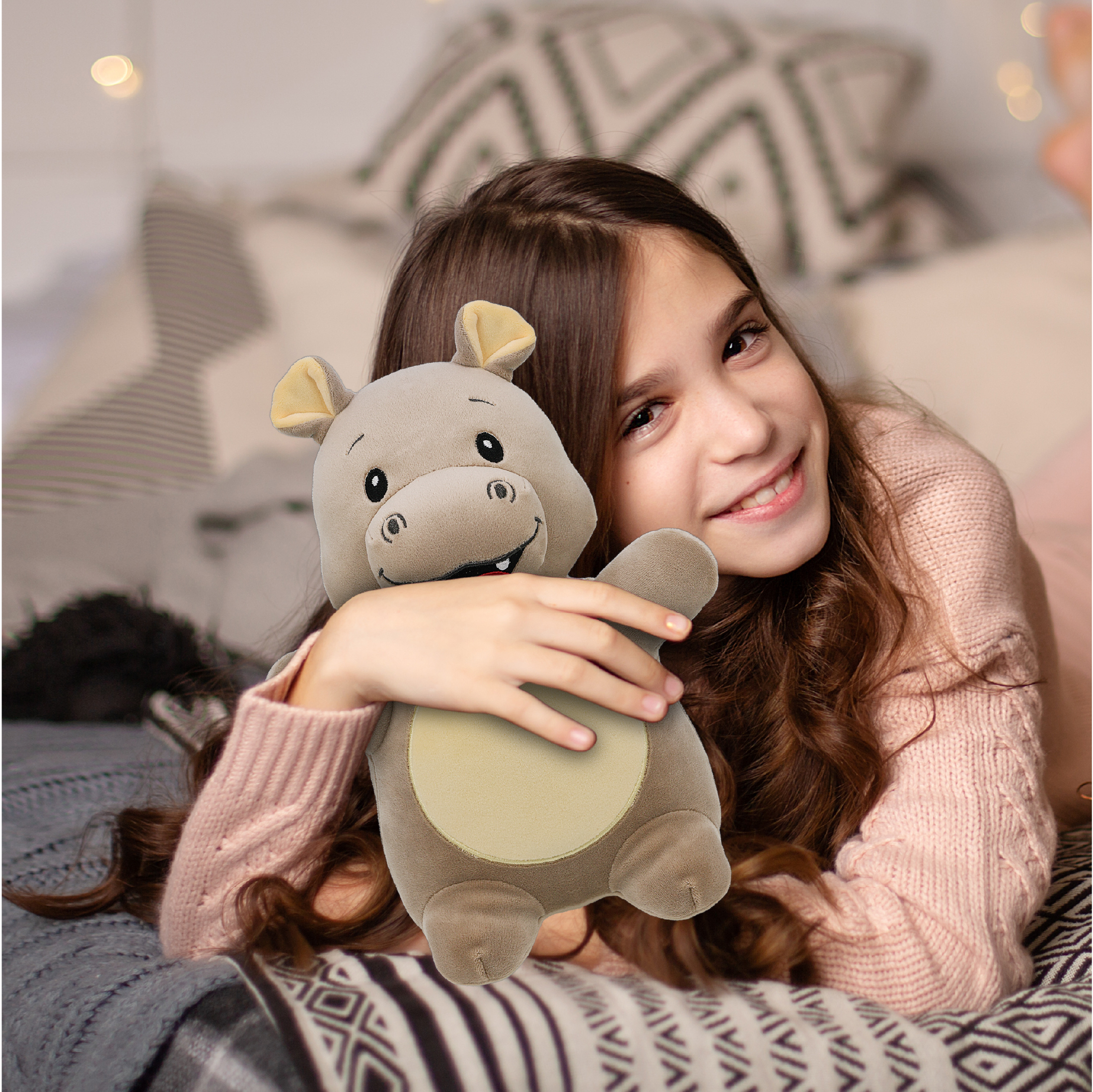 The DolliBu Snug Mooshies Standing Hippo stuffed animal is designed for teens, kids, and adults. It can be used for playtime, rest time, or display. The compact plush size makes it suitable for bedrooms, playrooms, desks, and shelves. It can be added to wild animal plush collections or used as a decorative animal plush figure. The Snug Mooshies Standing Hippo plush features a rounded body with a soft plush exterior and embroidered facial details inspired by wild animals. It is filled with a squishy stuffing material that provides a gentle, cushion-like structure. The plush is designed for holding, squeezing, and displaying. Its compact size allows for easy handling and placement. The Snug Mooshies Standing Hippo stuffed animal is made with 100% polyester materials. It is crafted with embroidered features. The plush exterior provides a smooth and soft surface texture. For care, wash with cold soapy water and allow to air dry. Includes 1 DolliBu Snug Mooshies Standing Hippo stuffed plush. The plush measures approximately 8Lx5.5Wx10H inches. The compact form makes it suitable for hugging, squeezing, carrying, and displaying. Designed for indoor use and everyday handling. Recommended for ages 3 years and up.